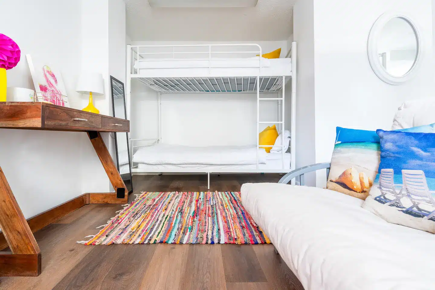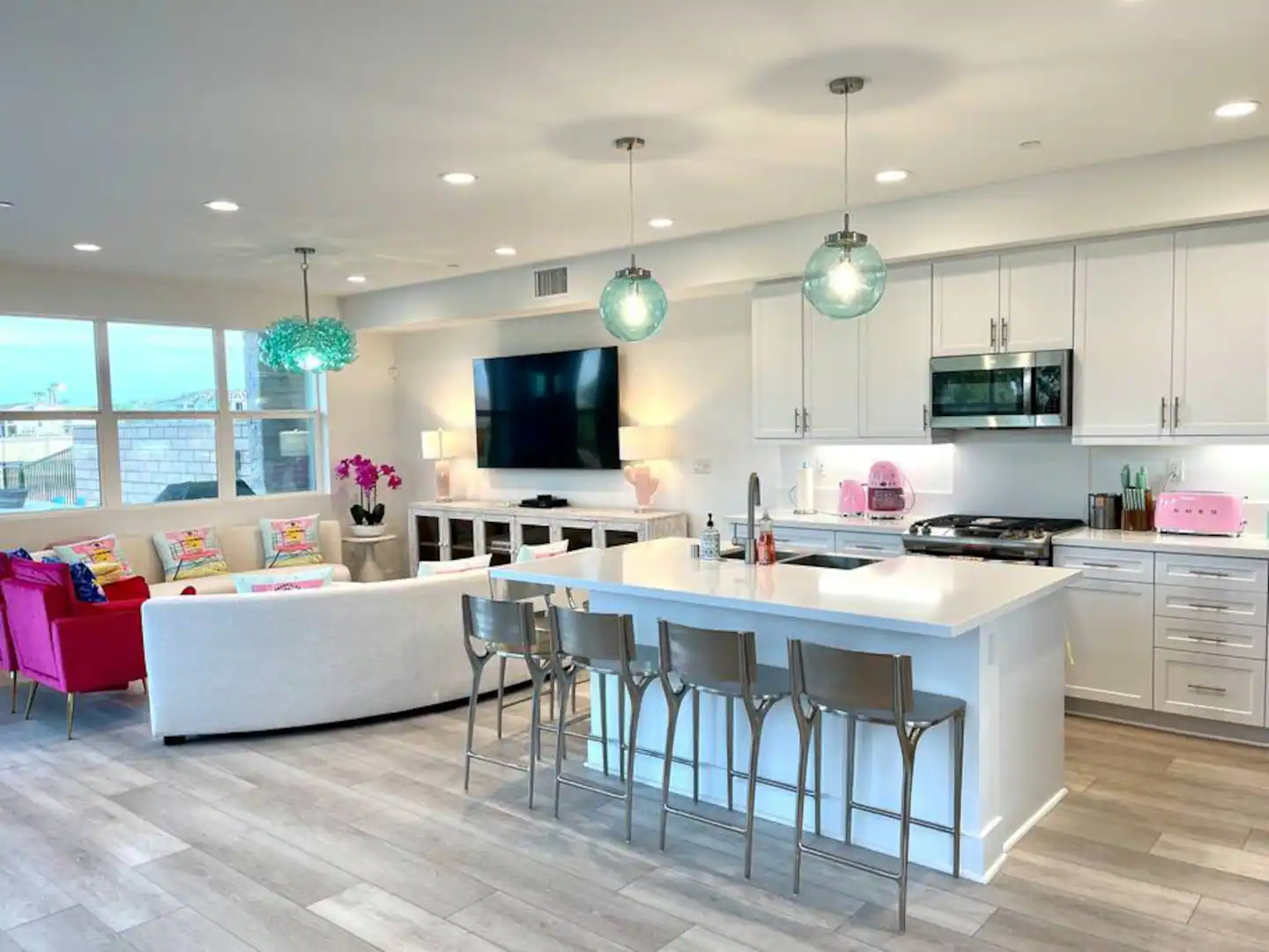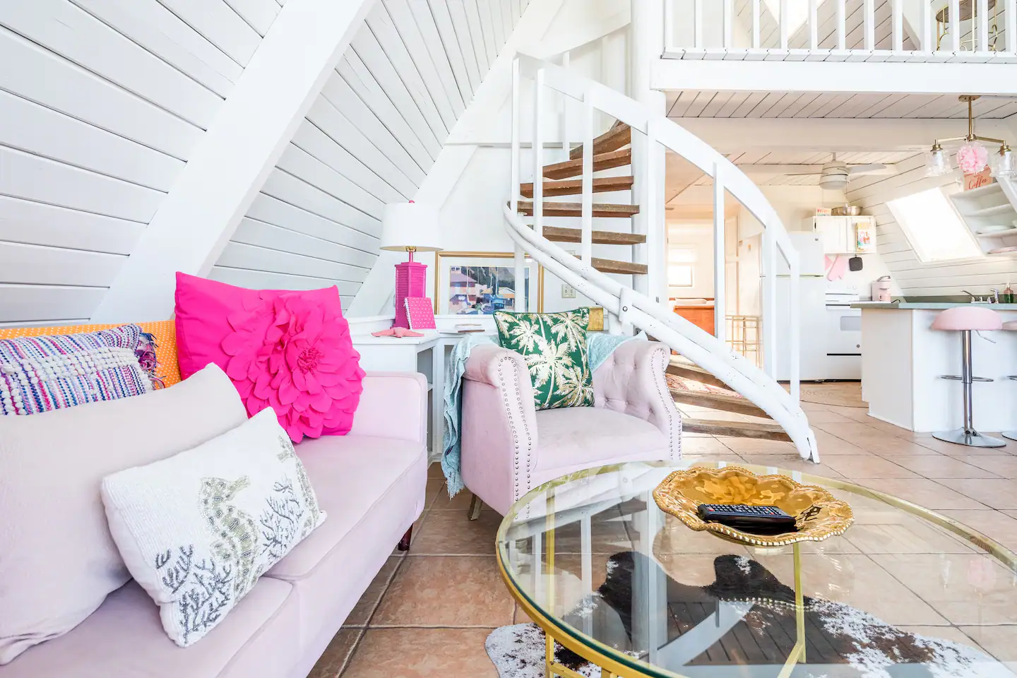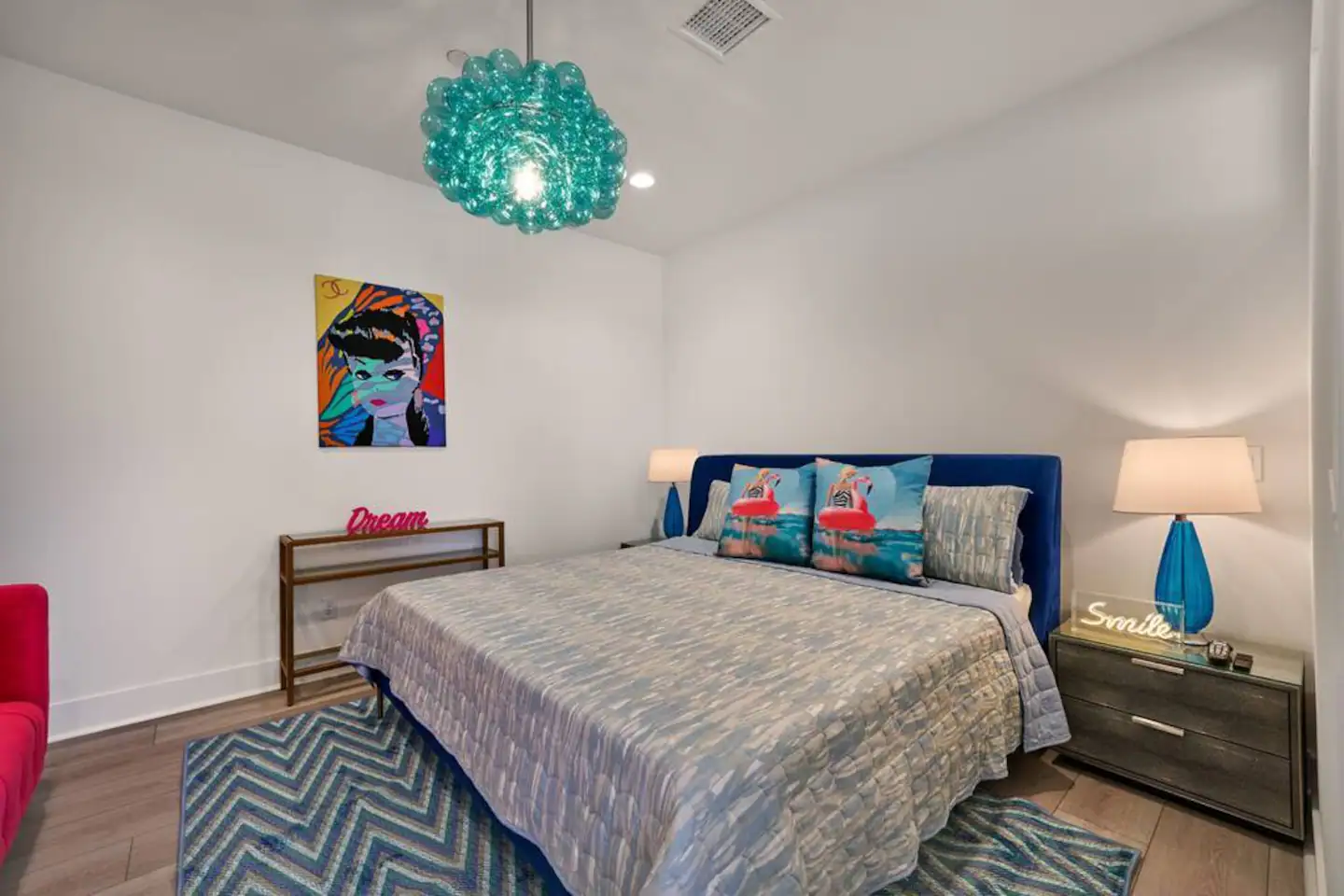 In Houston, the “Barbie Penthouse,” a Barbie-inspired escape pops against the urban backdrop, mere minutes from the city’s pulse and the airport’s gateway. Here, up to five guests find their slice of millennial nostalgia, reimagined with a dash of modern bougie. Hosting up to five guests, it boasts luxe queen beds and a sofa that doubles as the perfect crash spot for an impromptu guest.