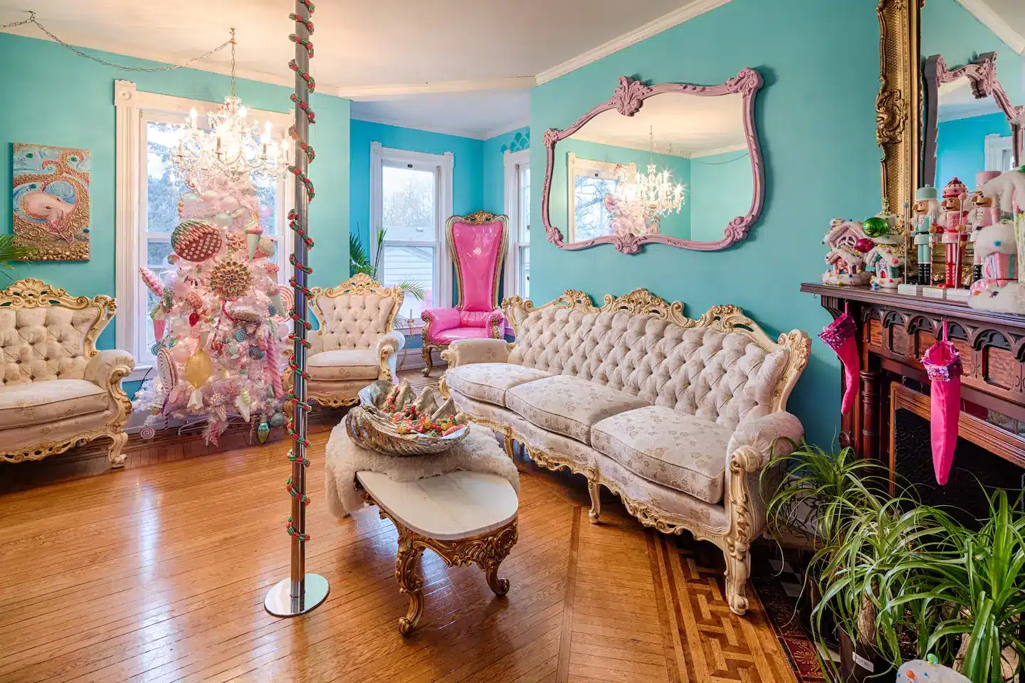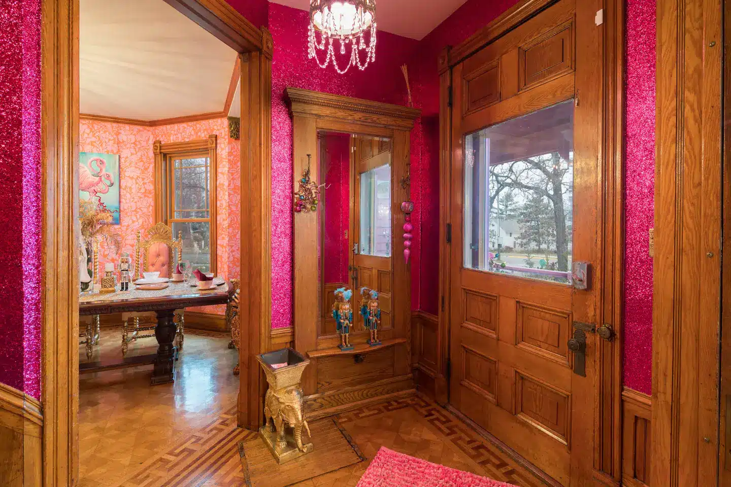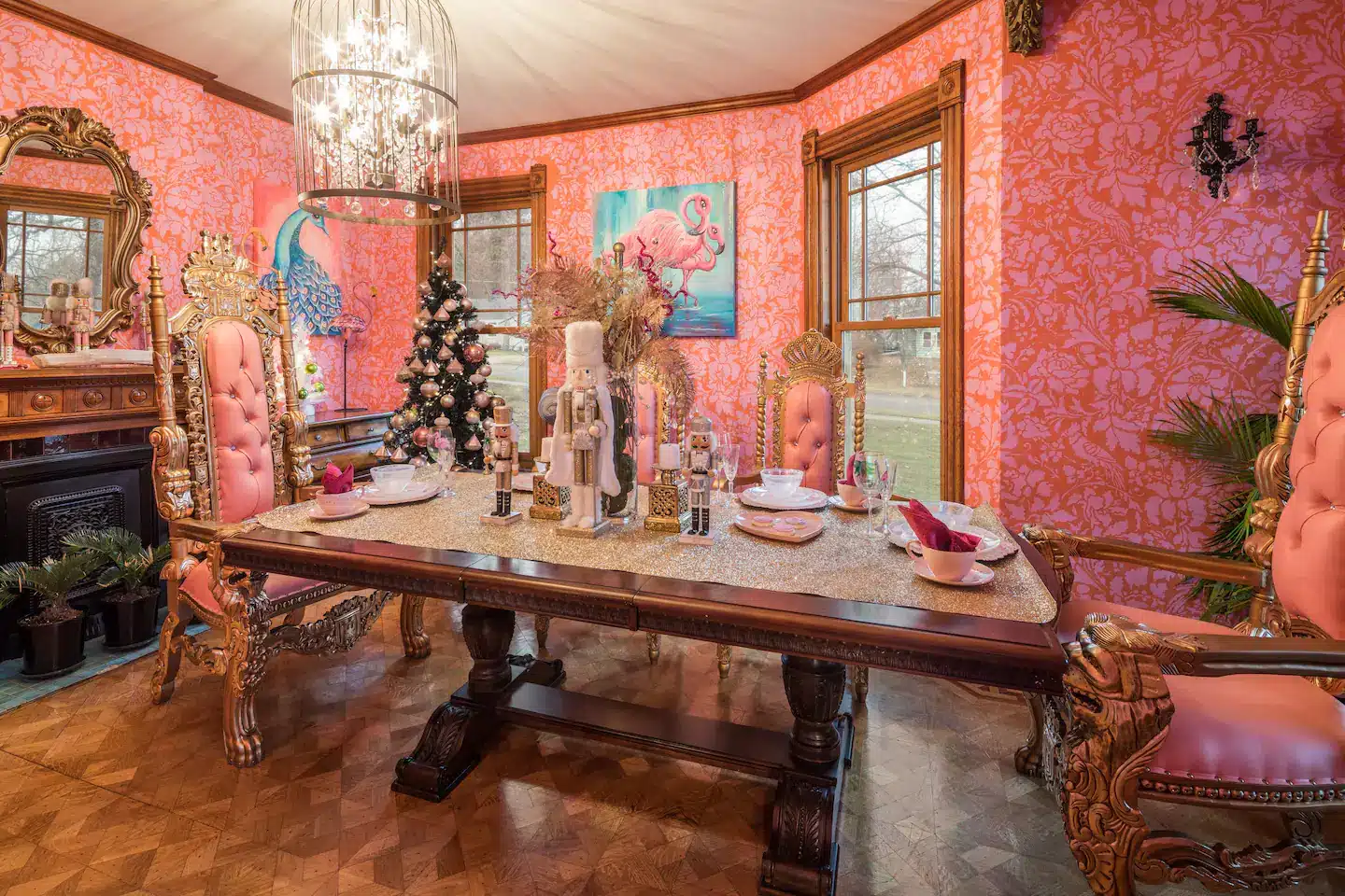 Victorian era style mansion with a touch of Barbie retro glamour? Yeah, we know it sounds like an odd pregnancy craving, but this property shows that this mix works spectacularly! Built in 1883, this vintage mansion peppered with Barbie’s whimsy charm flips the script on basic rental properties, offering a fusion of over-the-top glamour with splashes of pink that can’t help but pop on your socials.