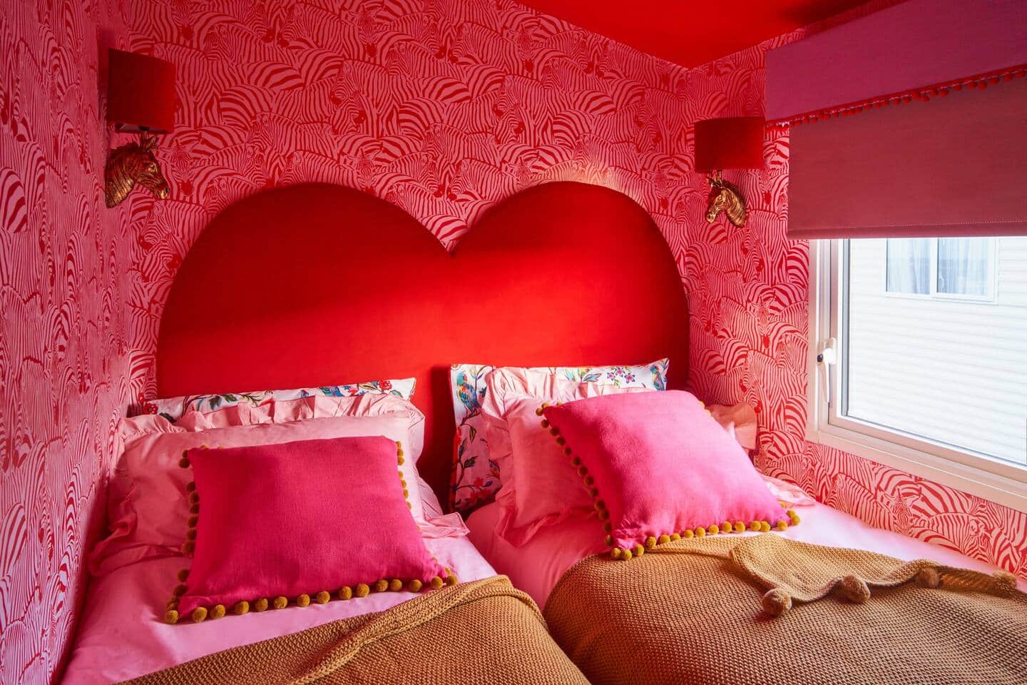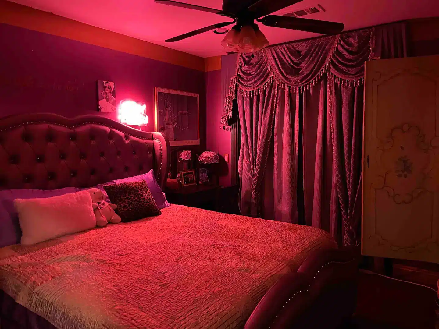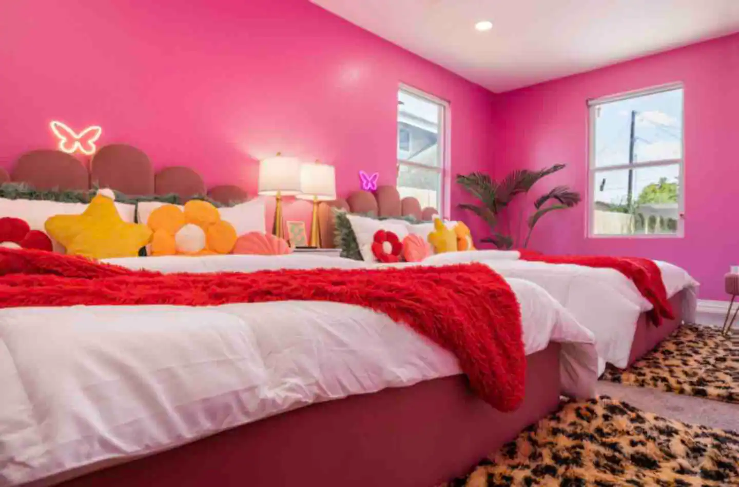 The primary bedroom is a neon-drenched, heart-accented haven where the essence of Barbie’s world meets grown-up glam—complete with plush red throws and pillows that beckon dreamy slumbers or endless scrolling sessions.