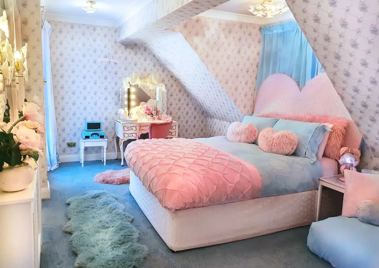 Adjacent, the bathroom transforms routine into ritual, with a walk-in shower and tub beneath the soft gaze of a pink, heart-shaped mirror—a selfie spot that’s hard to resist.