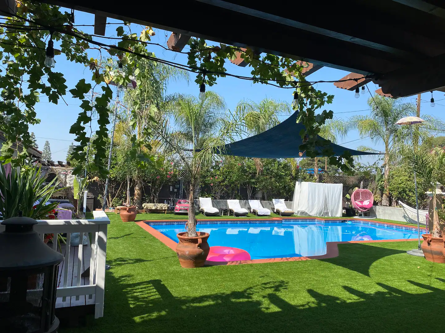 Relax and de-stress in your private, tropical resort rooms, with access to the backyard resort area that has a 12 foor deep, crystal clear pool and also an enclosed tropical garden area with it’s own daybeds and multiple lounging areas. There is even a full bar where you can mix your own drinks for relaxing. Come and enjoy your own private paradise. Within minutes of Hollywood and Universal City Walk.