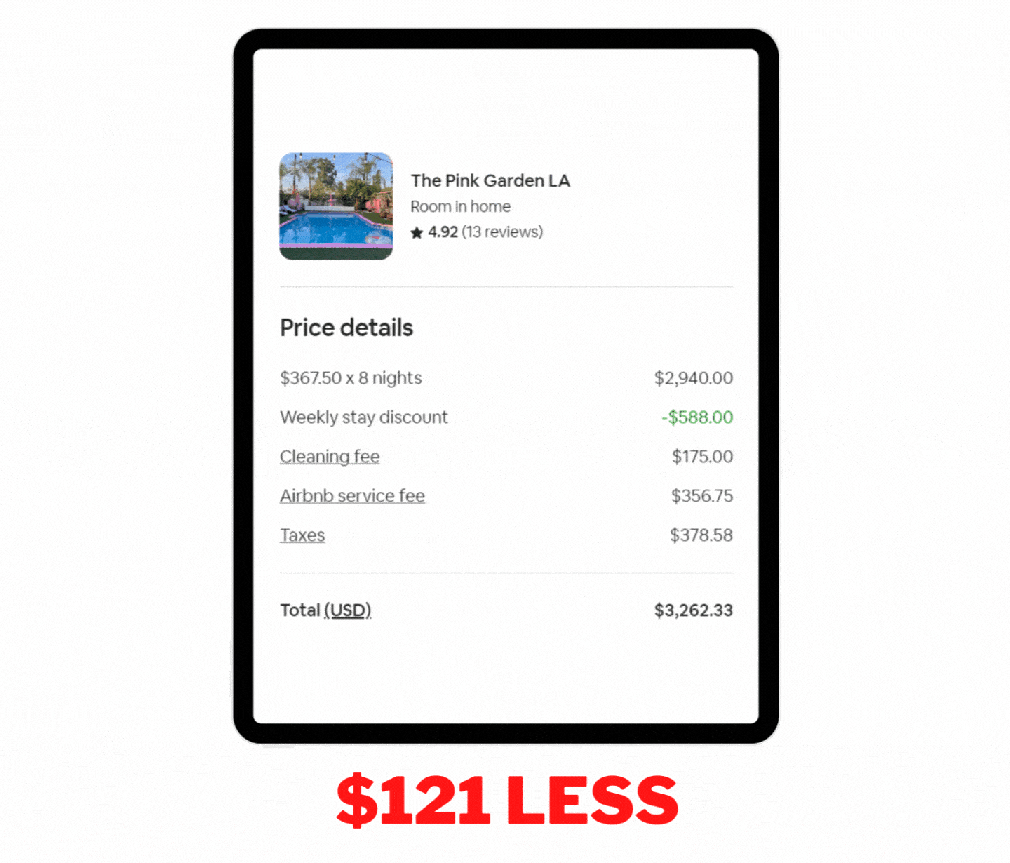 Lo and behold, found that there’s a likely match on Airbnb. Upon closer look, it’s the same dreamy spot for $121 less. Time to save big and live the doll life!