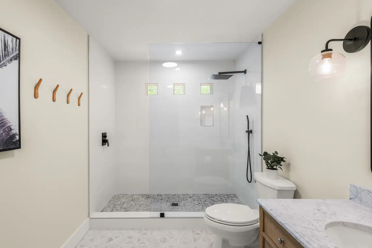 The backyard is an oasis of relaxation with a private pool, fire pit, BBQ, outdoor shower, and comfy patio furniture. Perfect for those lazy afternoons or evening hangouts with friends and family. And yes, there’s a six-seater golf cart ready for your coastal adventures.