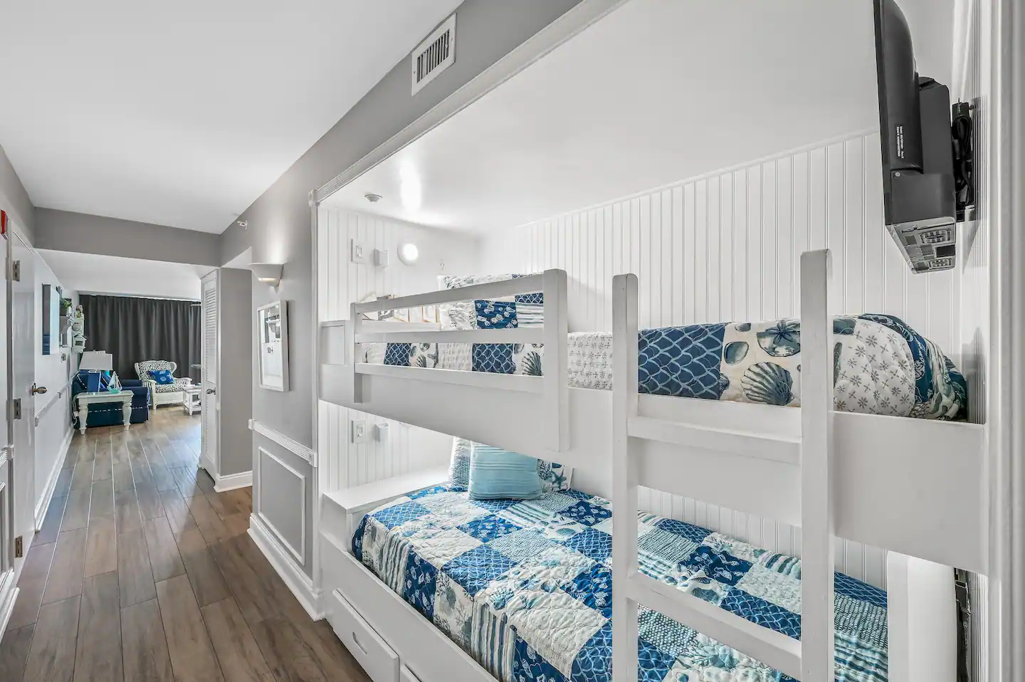 Two living areas make relaxation a breeze. The upstairs living area has a 55-inch TV, sleeper sofa, and access to beach-facing decks. The downstairs living area can be a fourth bedroom with a 42-inch TV and extra privacy.