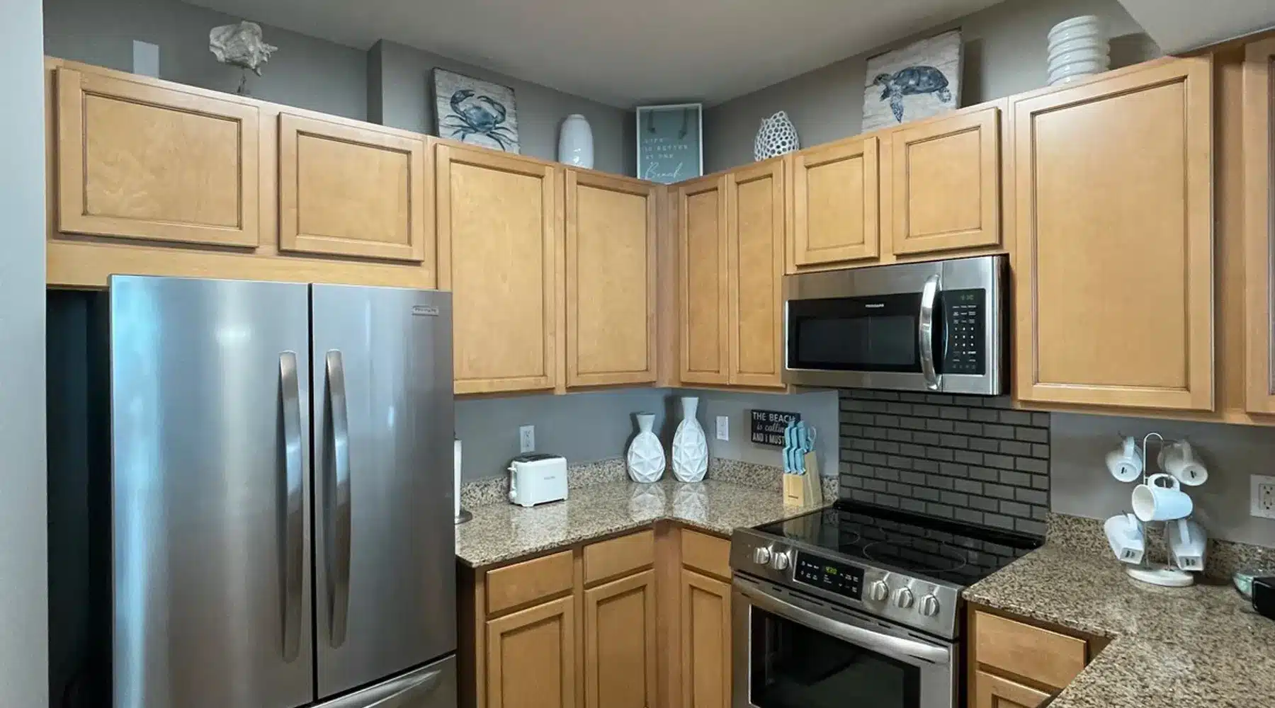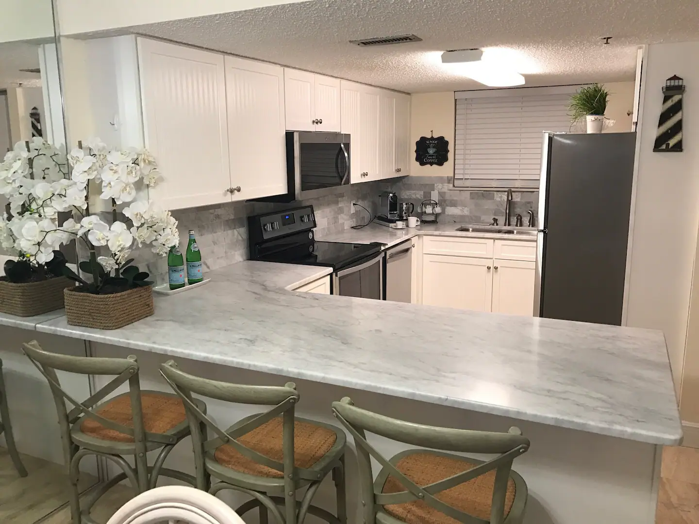 A fully stocked kitchen with stainless steel appliances and a coffee pot that can make a pot of coffee or a Keurig single cup. The kitchen has recently been brightened up by the installation of white quartz counter-tops.Bedrooms: