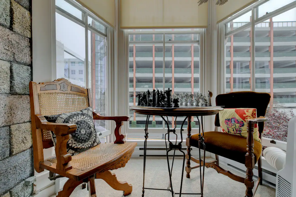 The bay window is a prime spot for some serene ‘muggle watching’ or perhaps to ponder over your next potion recipe. Despite the urban charm and occasional street symphony, the condo’s allure is undeniable, offering a unique retreat with all the necessary muggle amenities: a full kitchen, Wi-Fi, AC, and even Harry Potter Blu-Rays for a night in with your favorite witches and wizards.