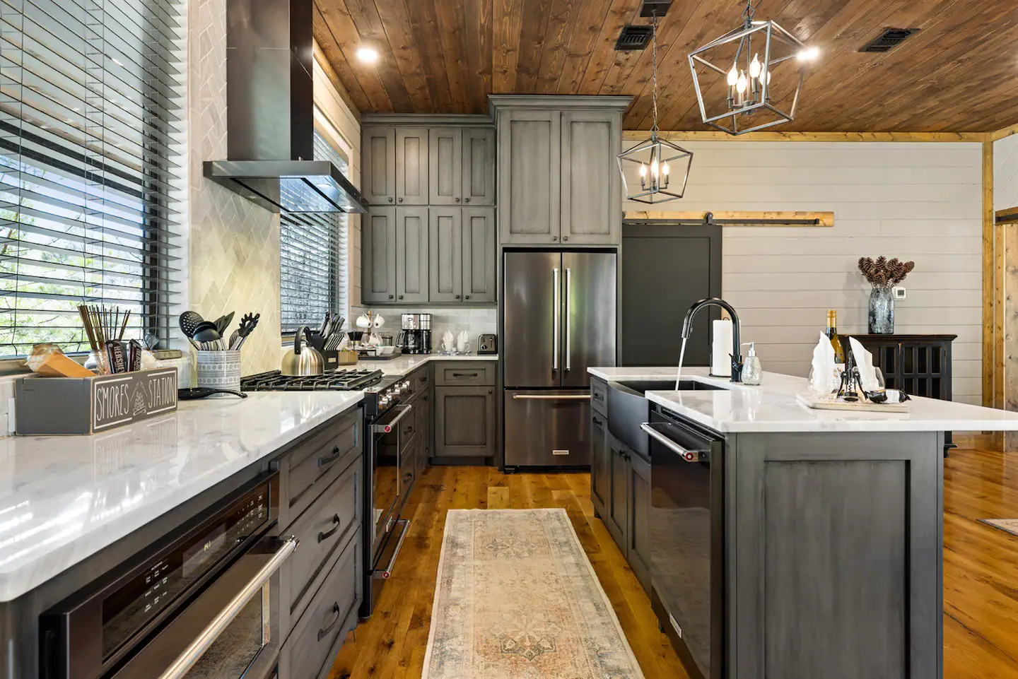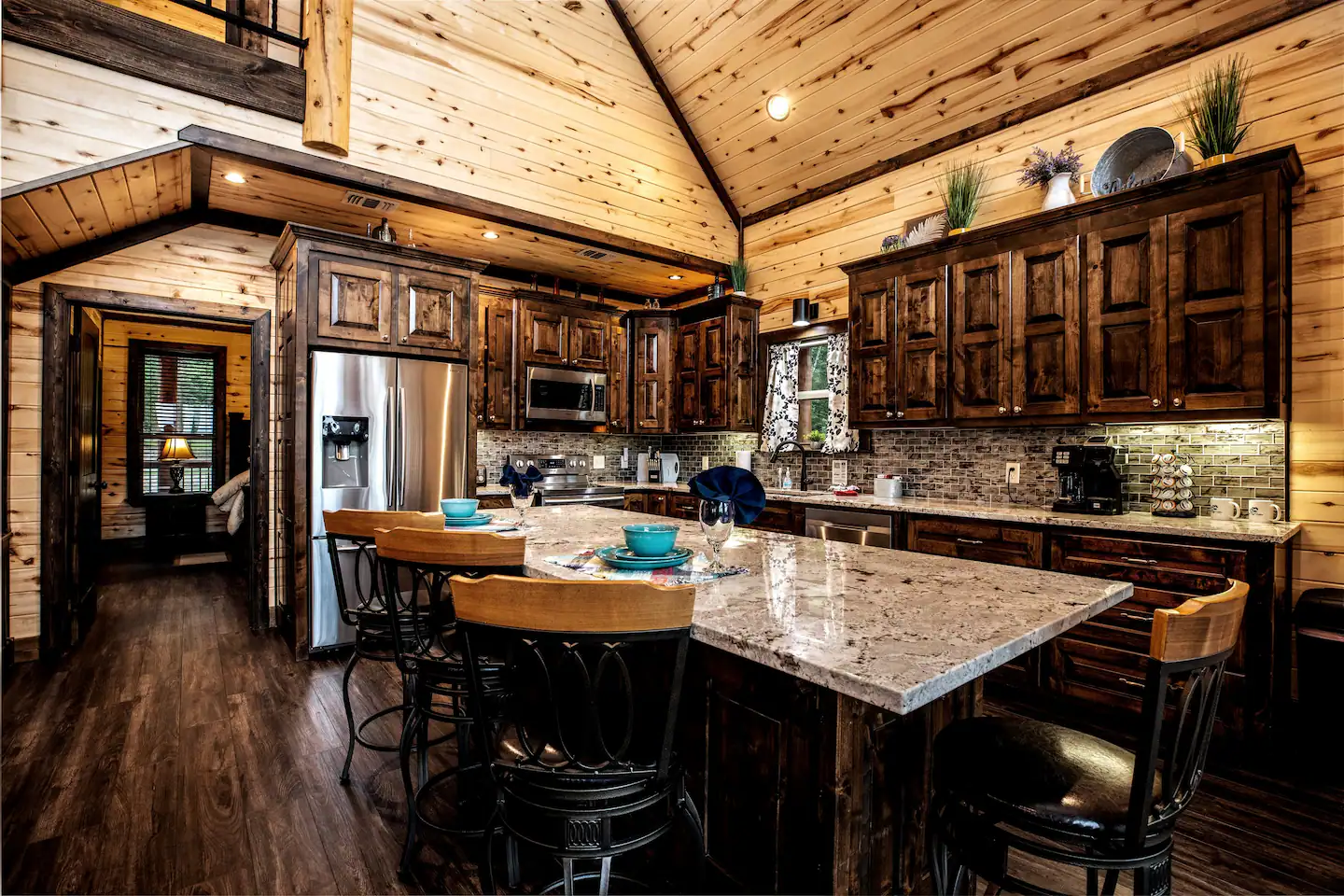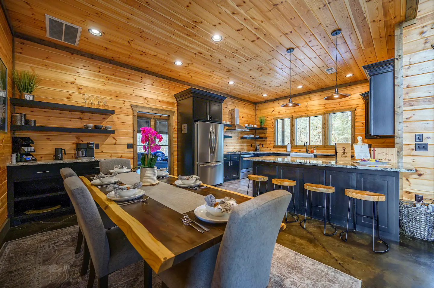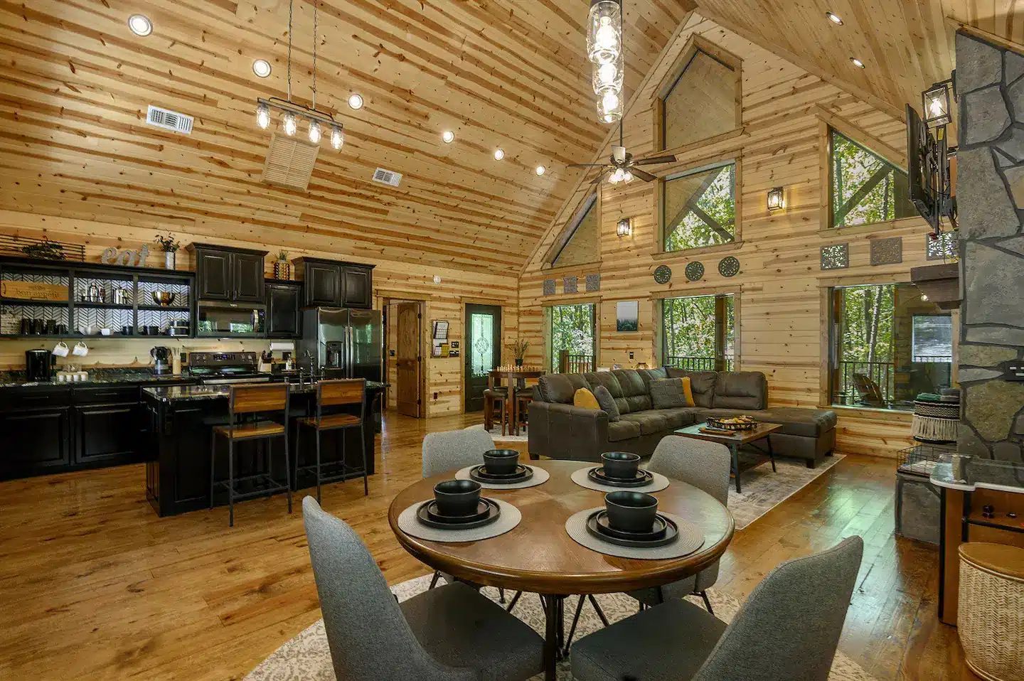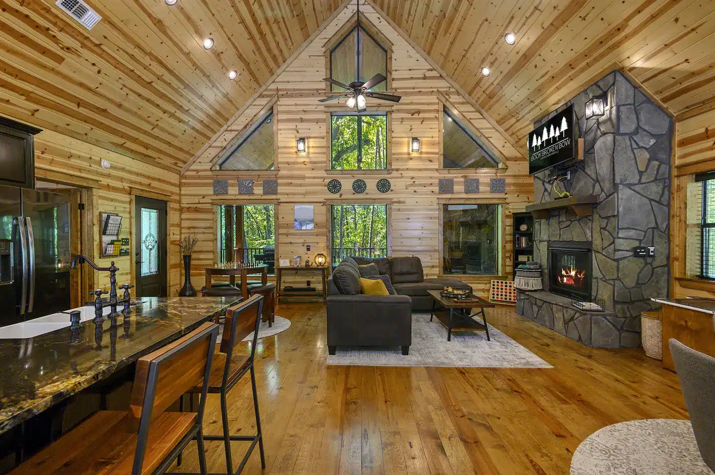 The cabin’s design screams modern rustic chic, from the soaring ceilings down to the stained pine floors. A pair of majestic rock fireplaces anchors the space, perfect for those nights when all you want to do is kick back and relax. The kitchen shines with black stainless steel and granite—ready for your foodie exploits, whether it’s a quick bite or a full feast.