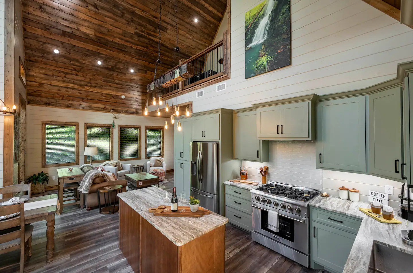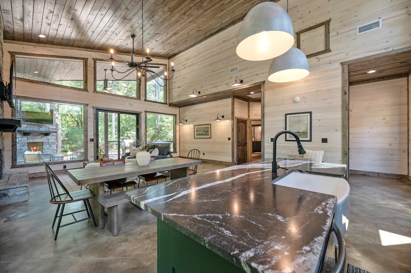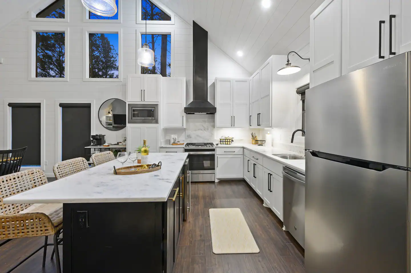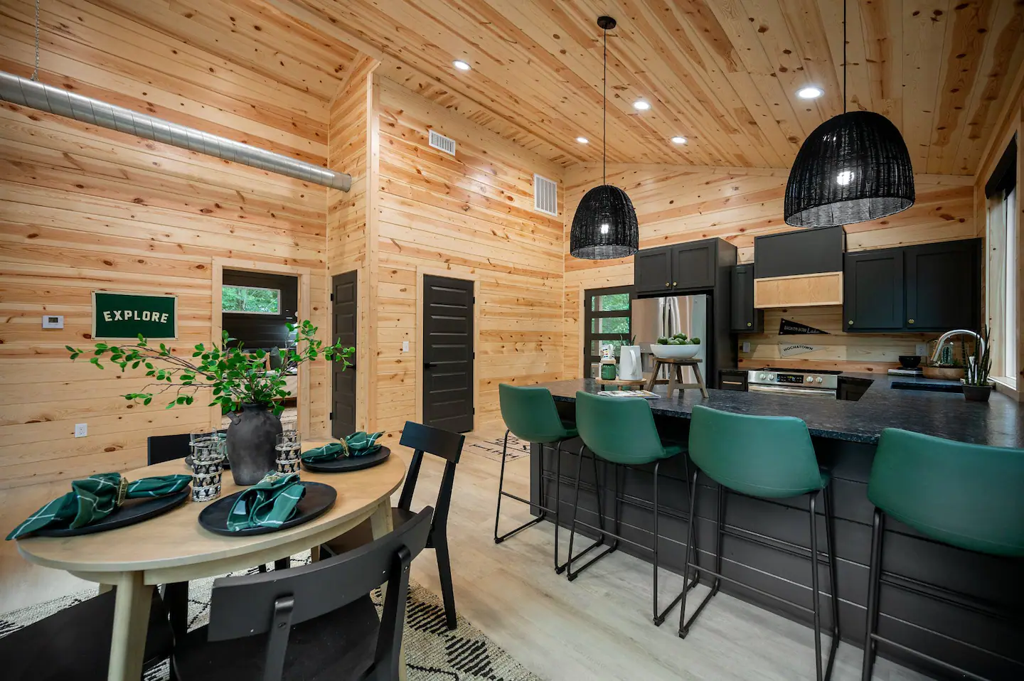 The cabin’s design screams modern rustic chic, from the soaring ceilings down to the stained pine floors. A pair of majestic rock fireplaces anchors the space, perfect for those nights when all you want to do is kick back and relax. The kitchen shines with black stainless steel and granite—ready for your foodie exploits, whether it’s a quick bite or a full feast.