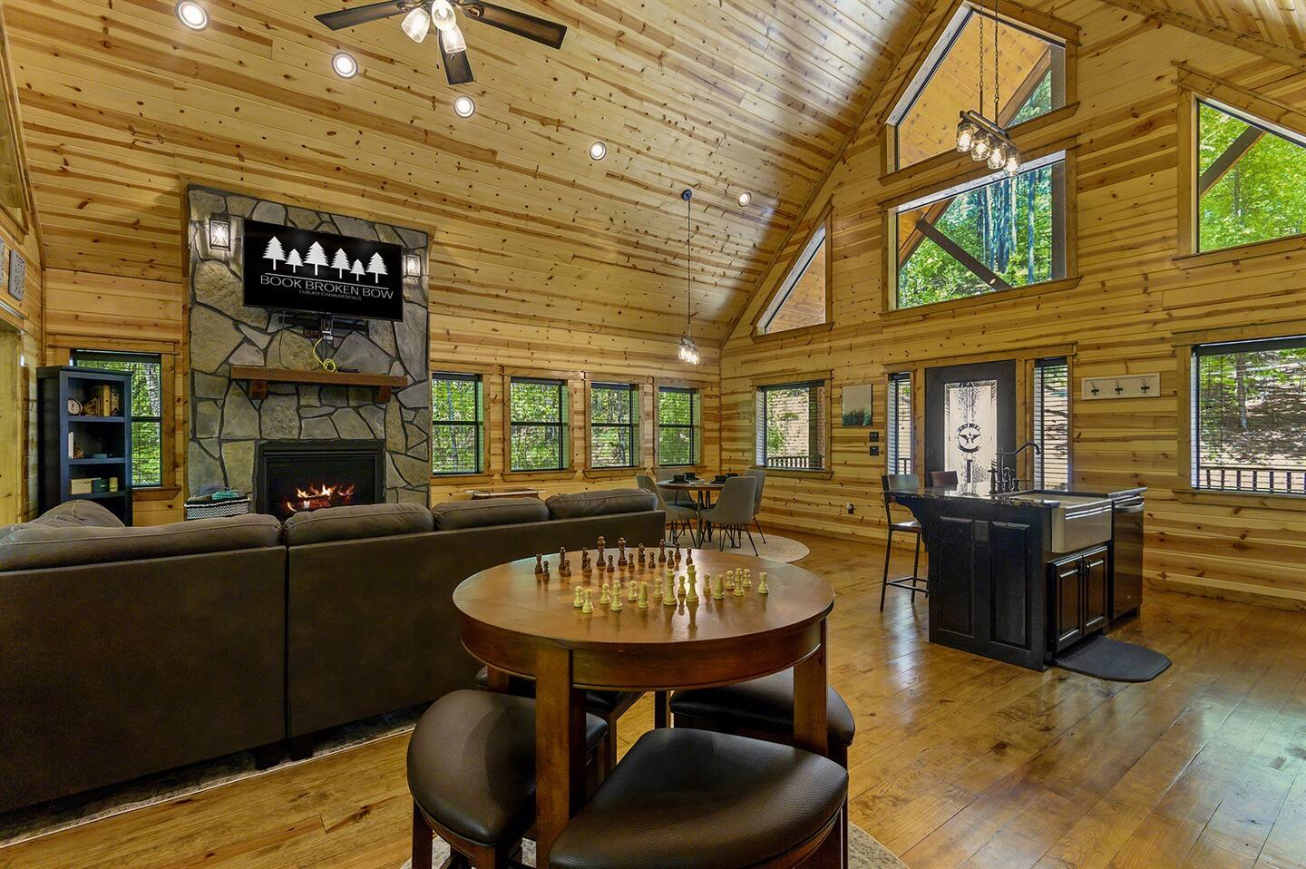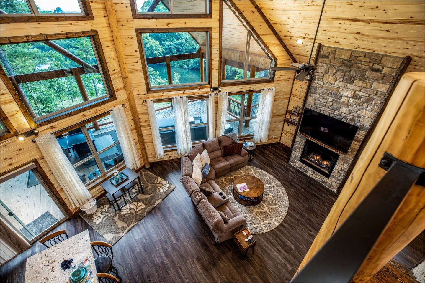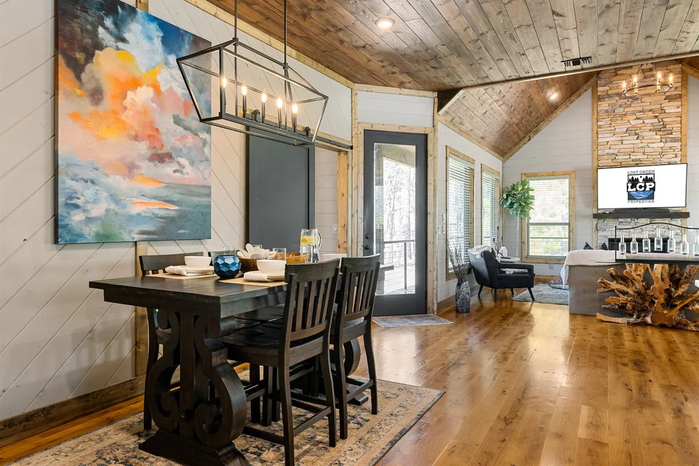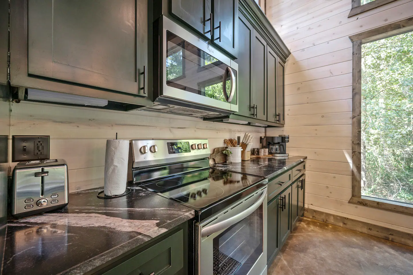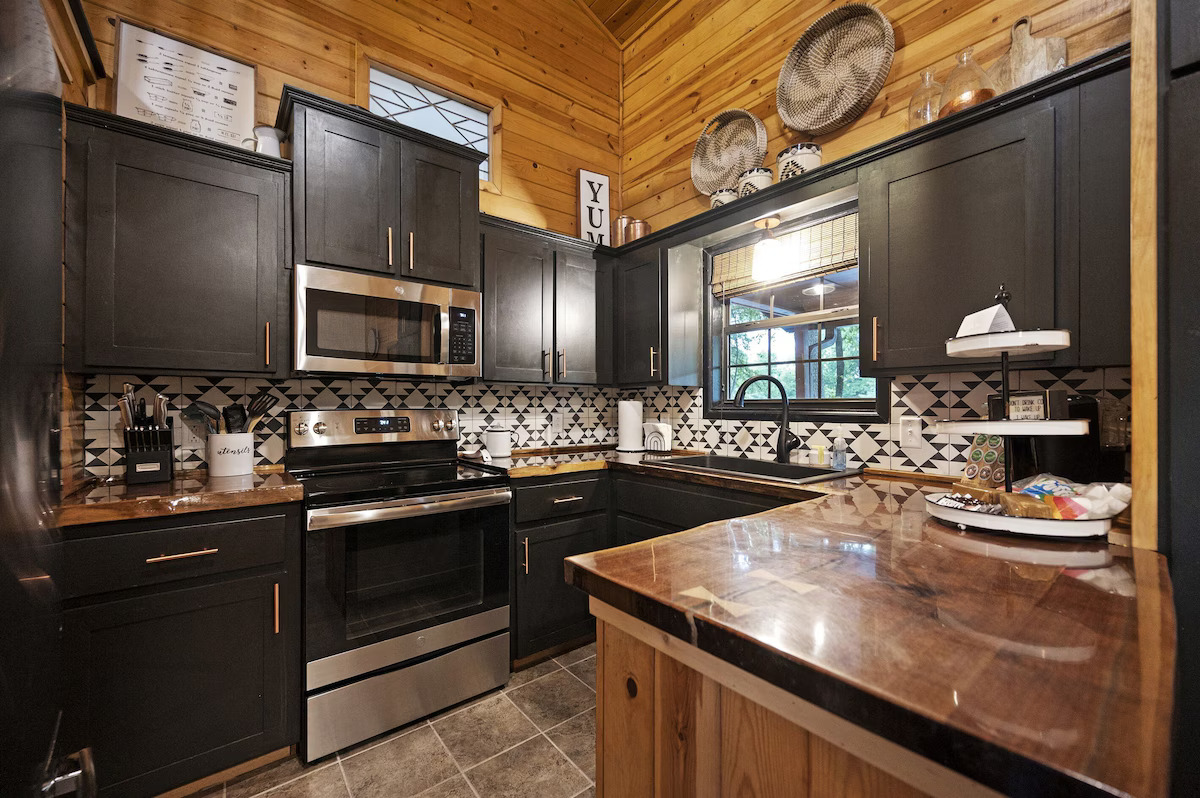 The cabin’s design screams modern rustic chic, from the soaring ceilings down to the stained pine floors. A pair of majestic rock fireplaces anchors the space, perfect for those nights when all you want to do is kick back and relax. The kitchen shines with black stainless steel and granite—ready for your foodie exploits, whether it’s a quick bite or a full feast.
