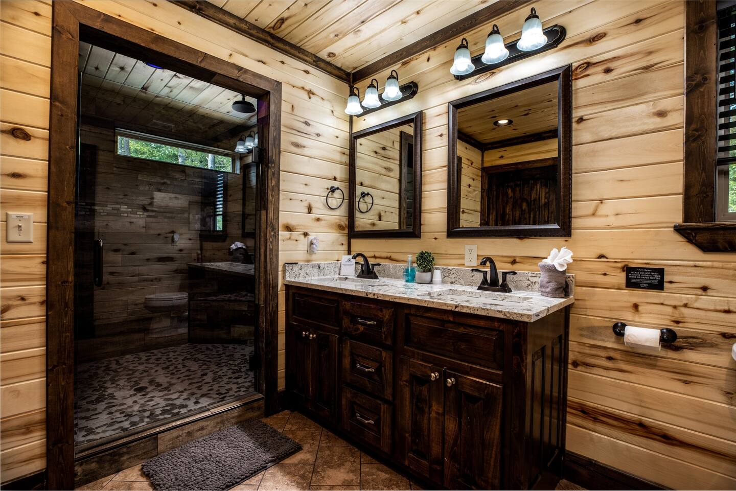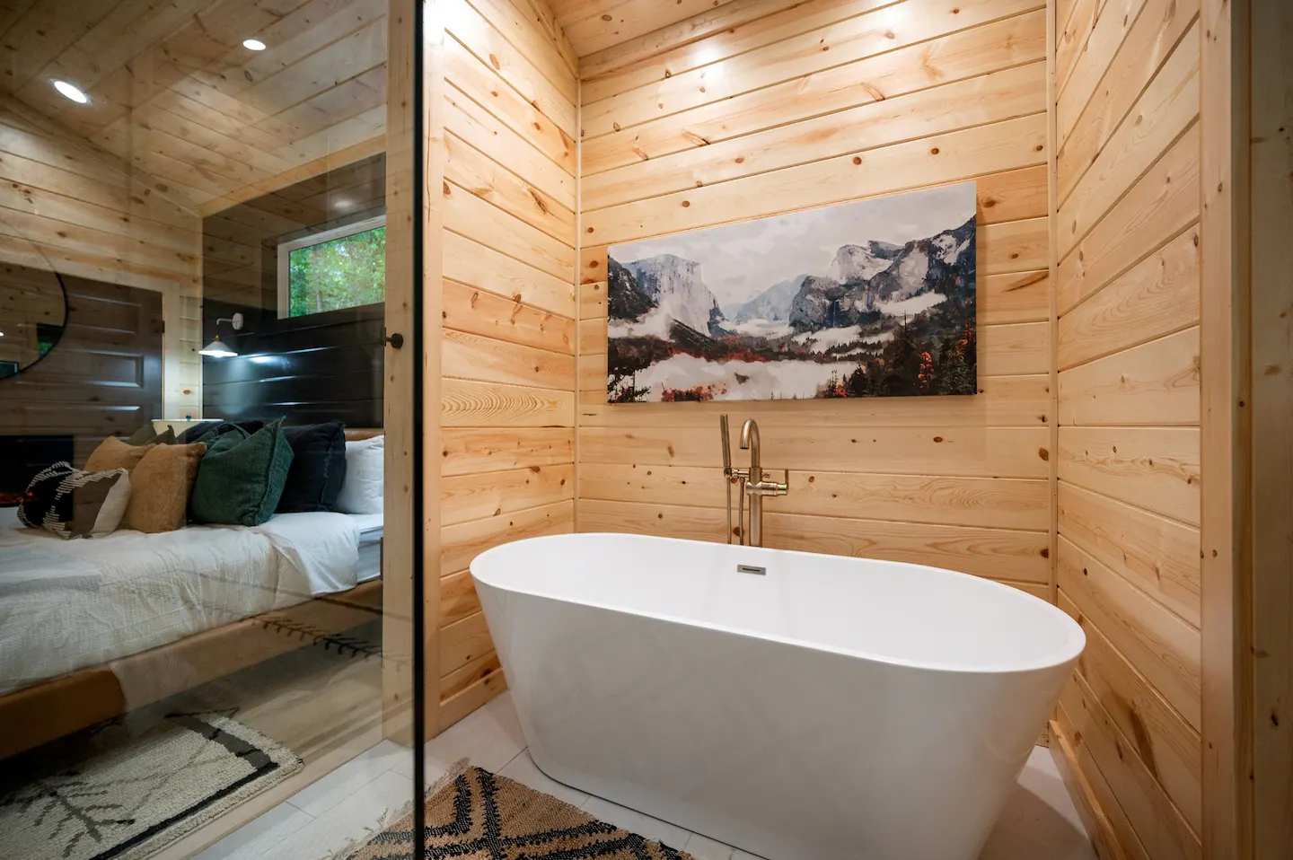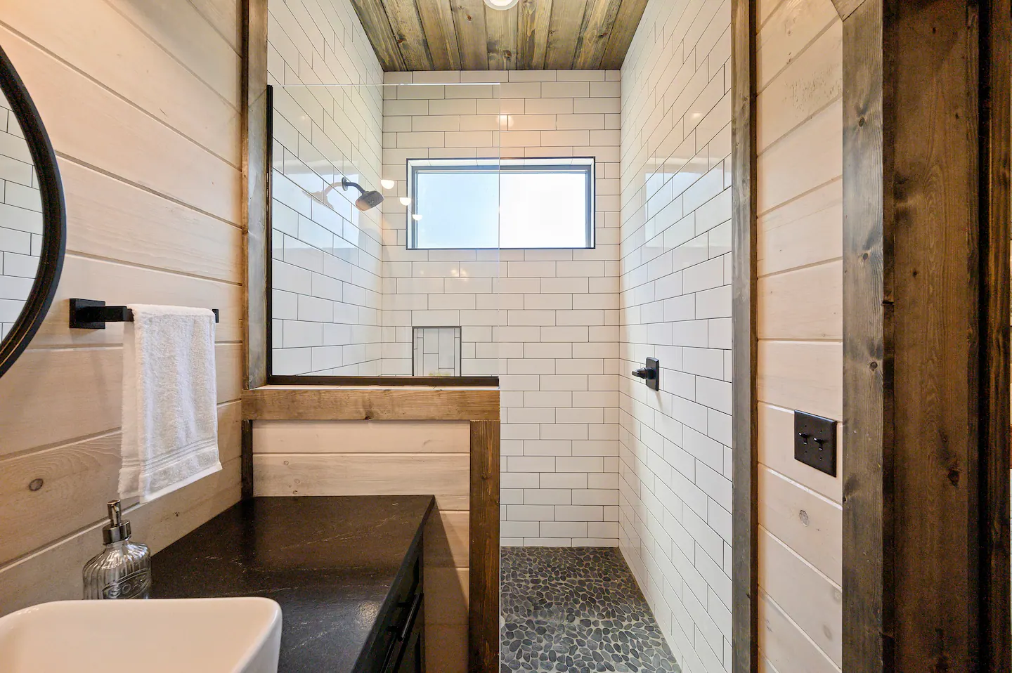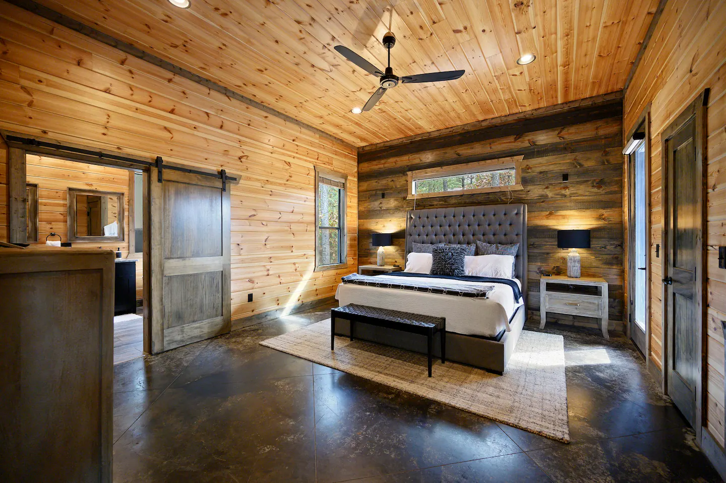 This cabin features a high pitched roof to give the cabin a grand, yet cozy feeling. The walls are painted with a subtle warm earth tone to compliment the stained wood ceilings. We incorporated a lot of natural earthy colors and artwork to give you the feeling of an escape to nature and hidden waterfalls in every room! The cabin has two bedrooms, but at just over 2000sq ft, it’s quite spacious and never cramped. The bedrooms, bathrooms and showers are all oversized, and every finish was custom designed for luxury and comfort.