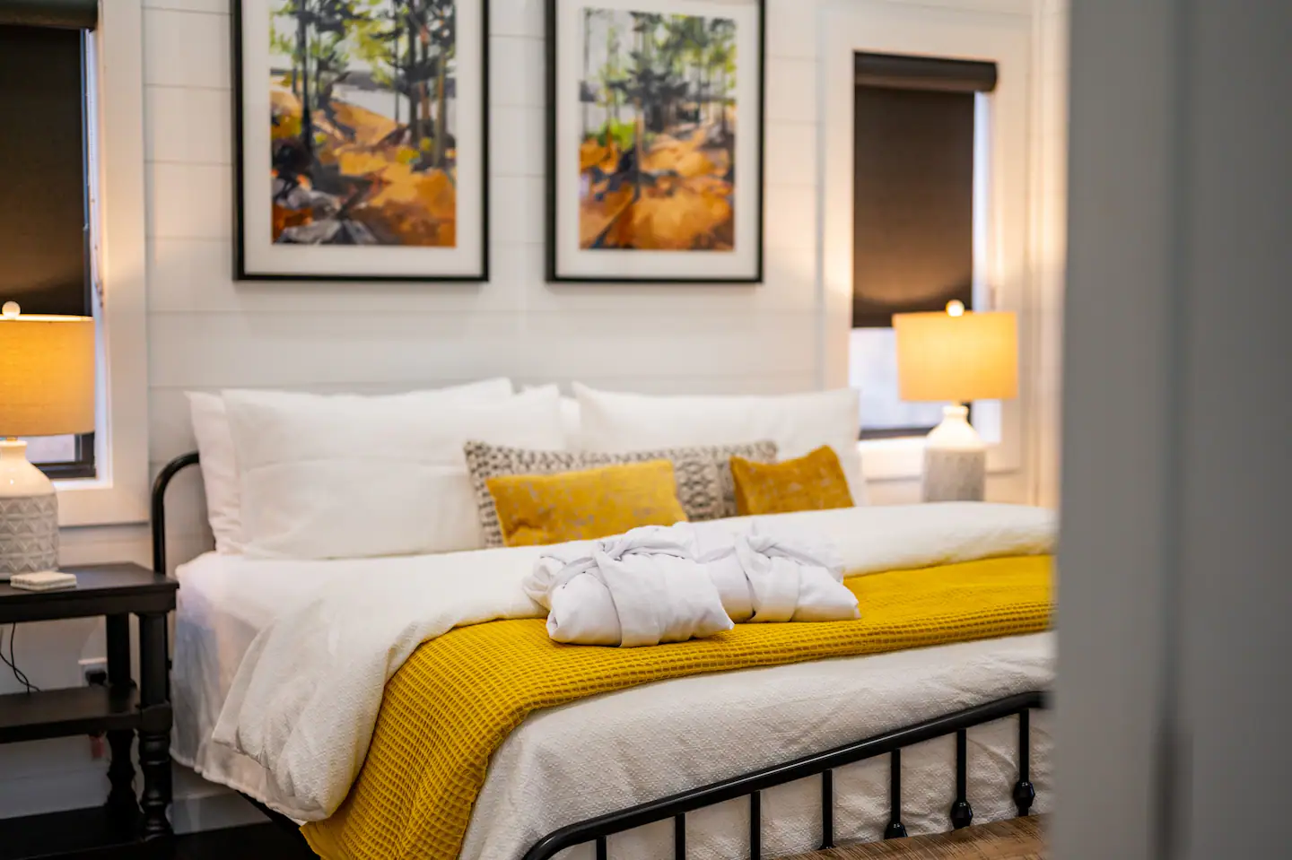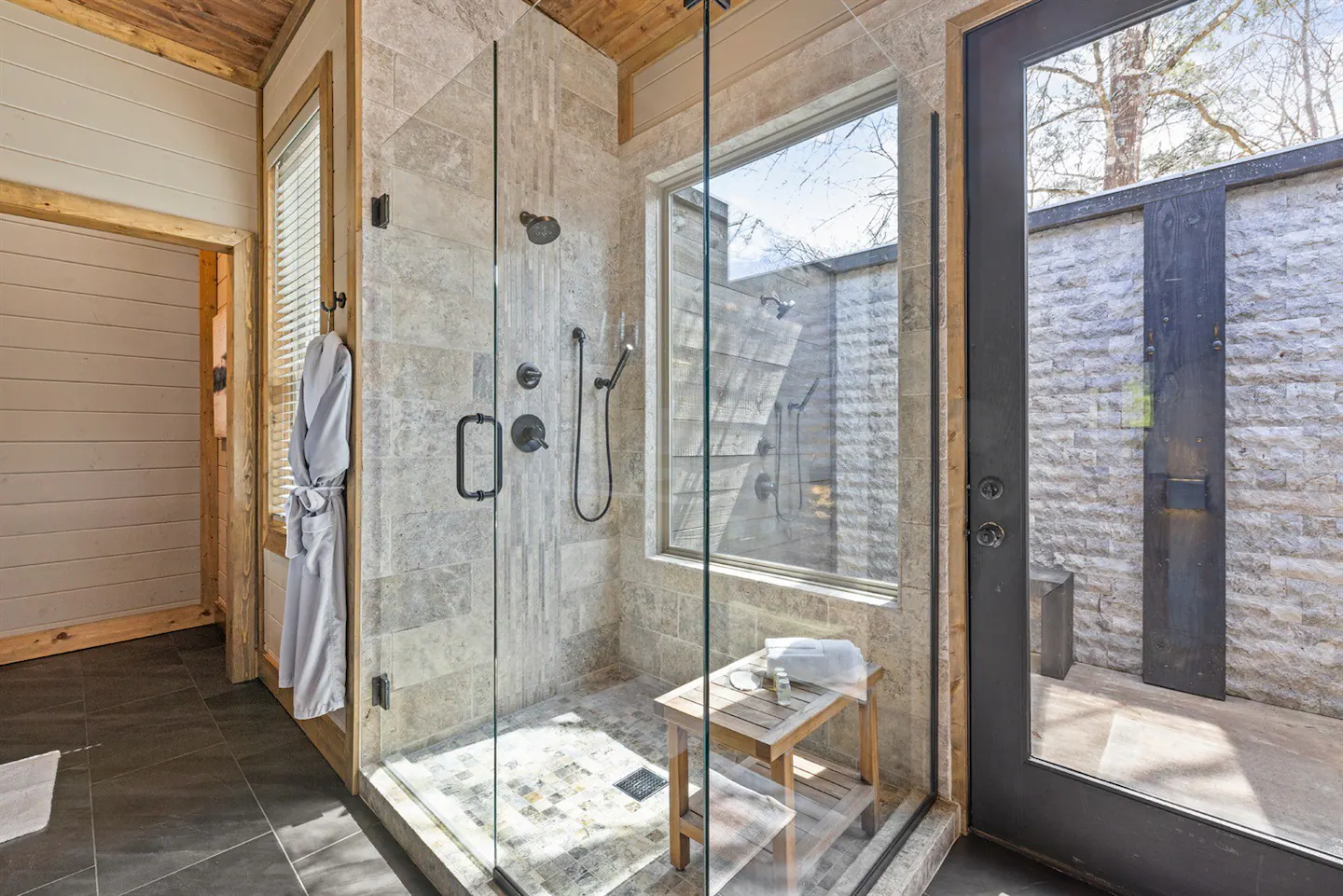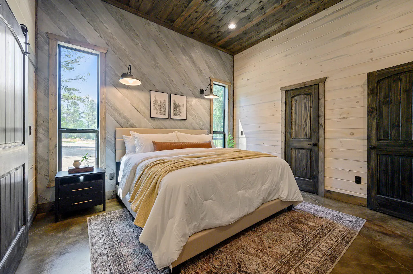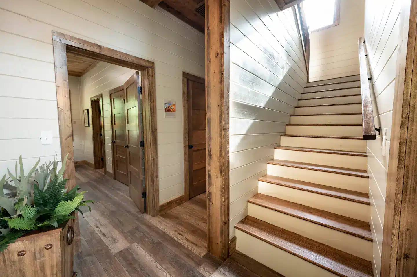 This cabin features a high pitched roof to give the cabin a grand, yet cozy feeling. The walls are painted with a subtle warm earth tone to compliment the stained wood ceilings. We incorporated a lot of natural earthy colors and artwork to give you the feeling of an escape to nature and hidden waterfalls in every room! The cabin has two bedrooms, but at just over 2000sq ft, it’s quite spacious and never cramped. The bedrooms, bathrooms and showers are all oversized, and every finish was custom designed for luxury and comfort.