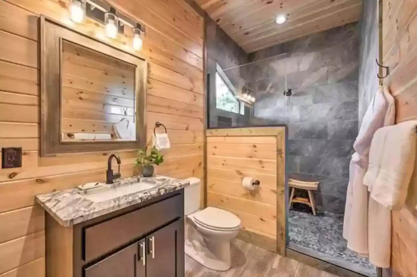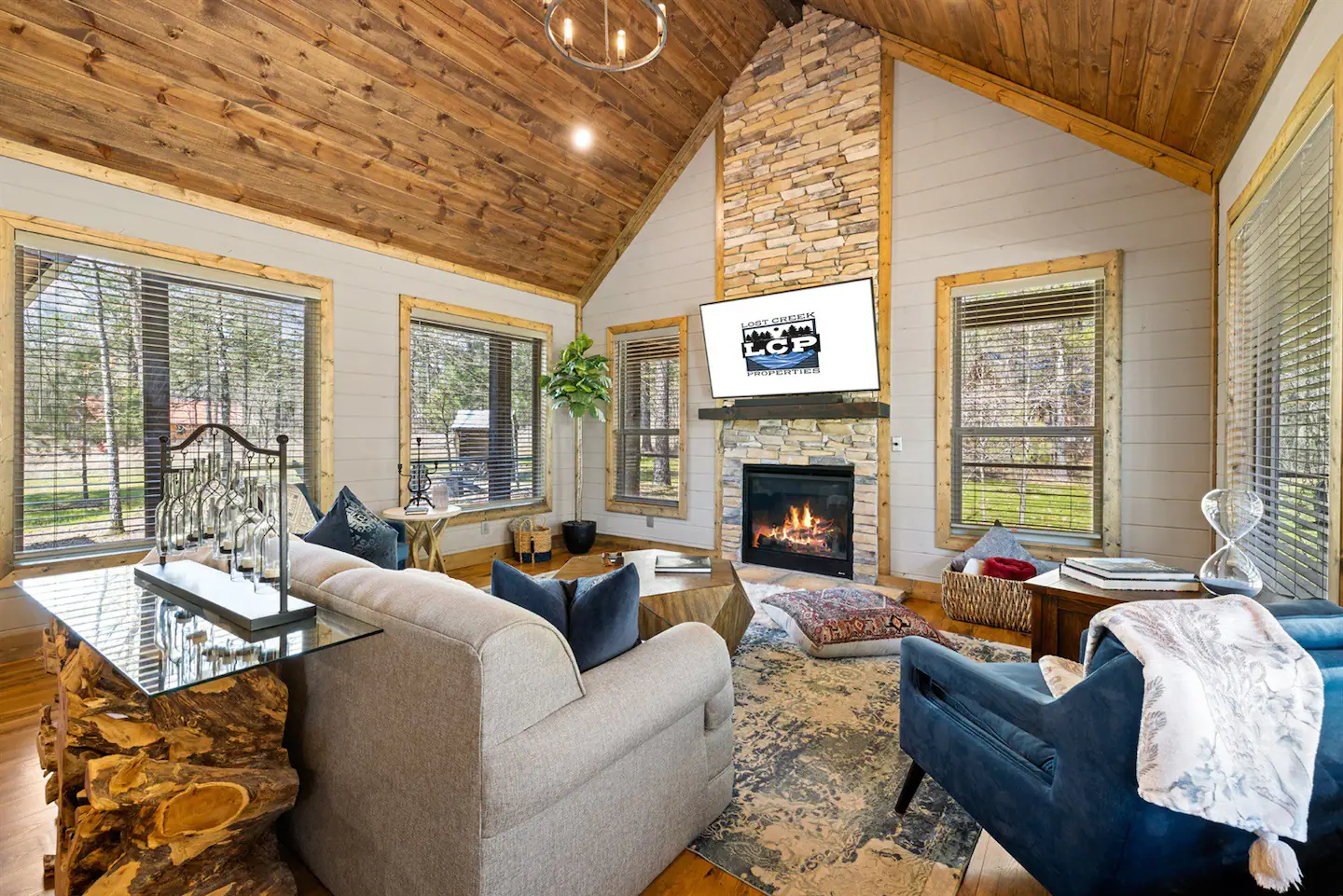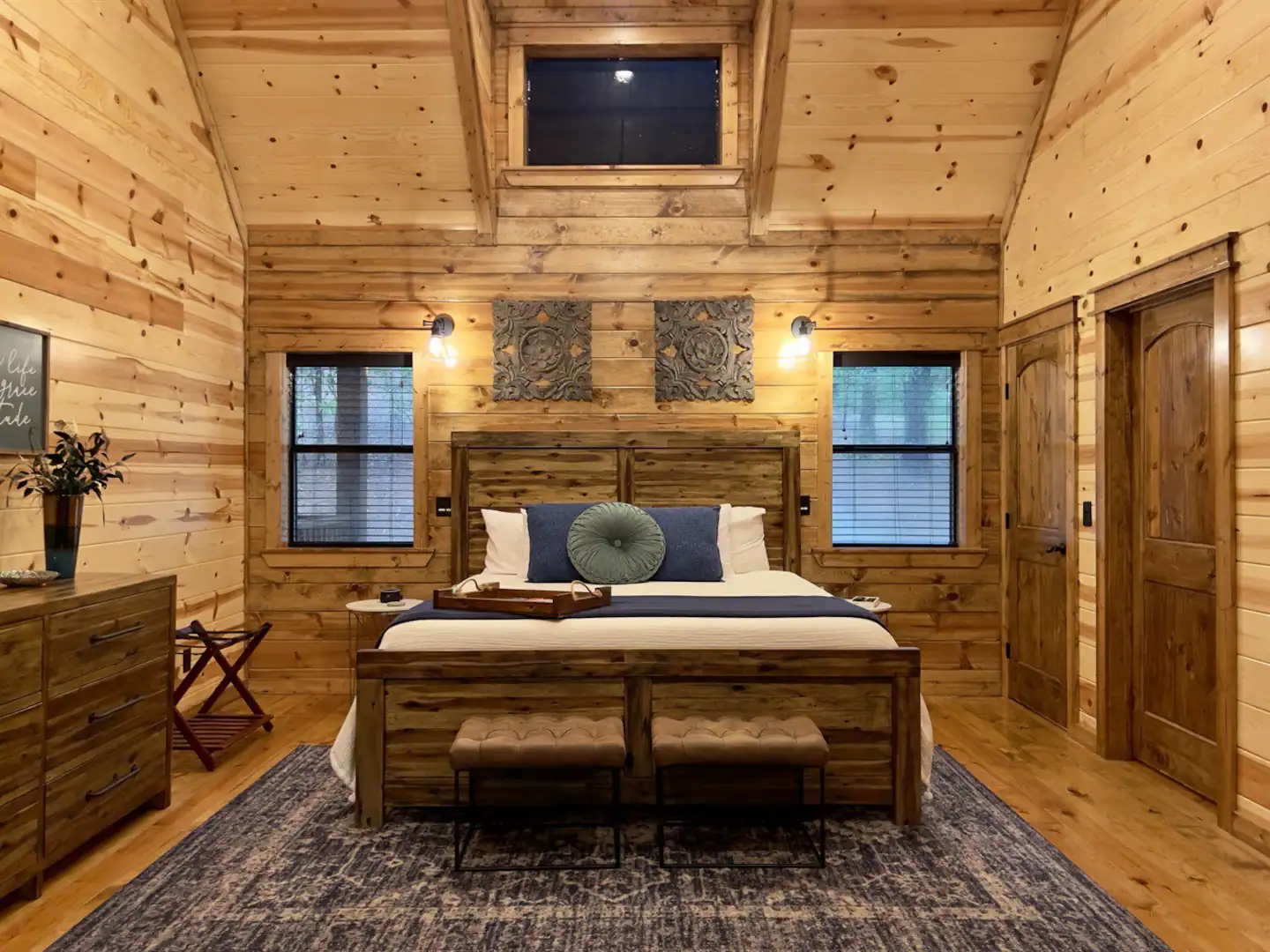 This cabin features two master bedrooms, each decked out with king beds and private bathrooms, ensuring a cozy and private vibe. With high-speed Wi-Fi and several smart TVs, you’re all set for a Netflix binge or scrolling through social feeds. Although it sleeps six, four adults will find it super comfy without cramping anyone’s style.