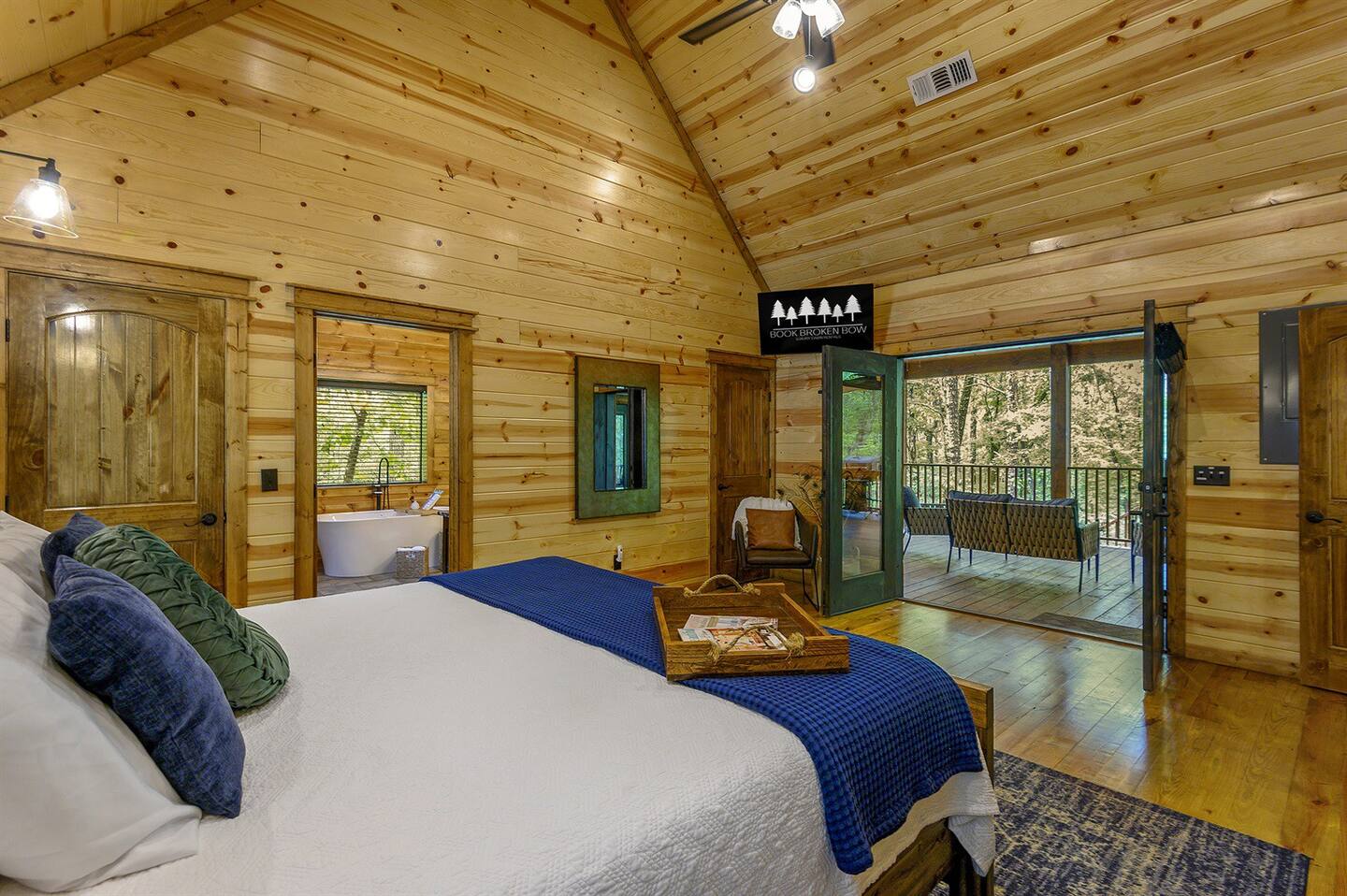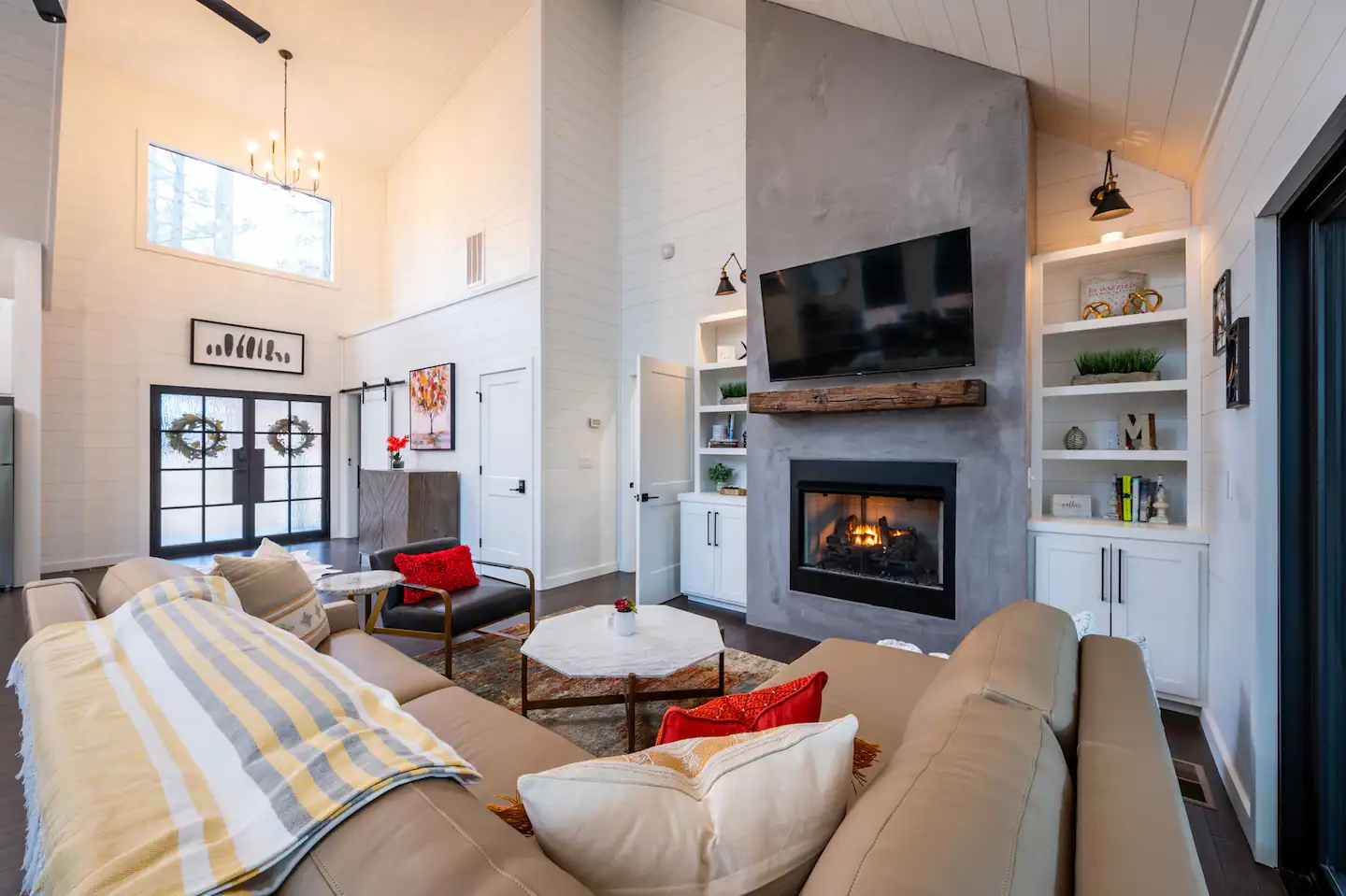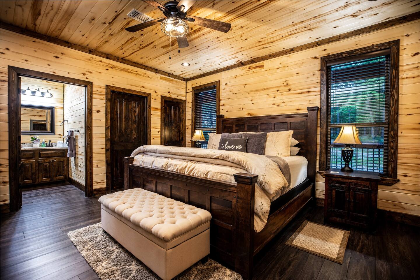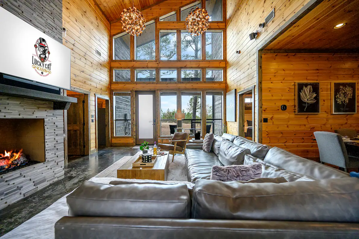 This cabin features two master bedrooms, each decked out with king beds and private bathrooms, ensuring a cozy and private vibe. With high-speed Wi-Fi and several smart TVs, you’re all set for a Netflix binge or scrolling through social feeds. Although it sleeps six, four adults will find it super comfy without cramping anyone’s style.