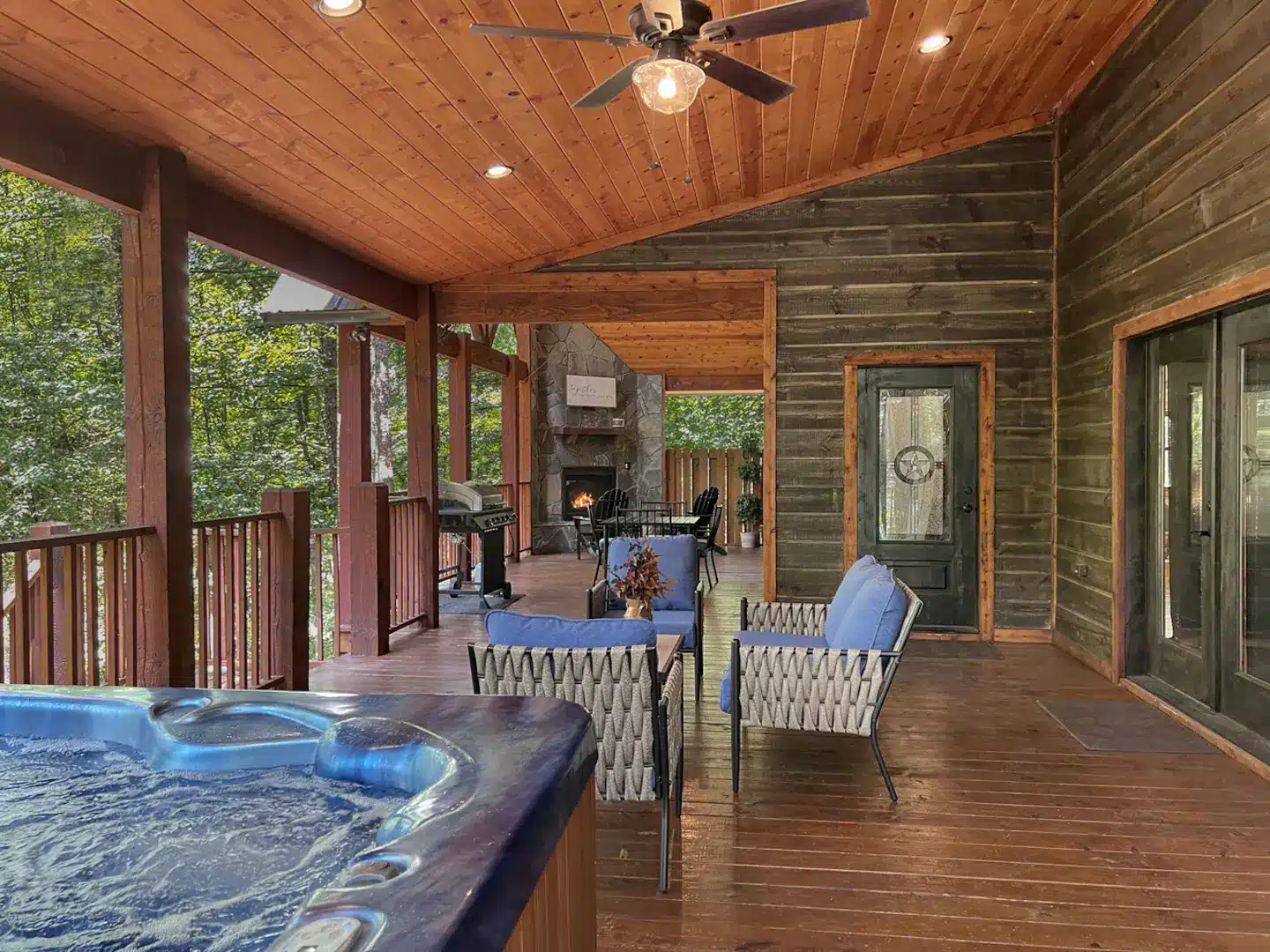 One of the most attractive aspects of Couples Cabin on the Creek is the large covered back deck, which is perfect for all kinds of entertainment or relaxation. The back deck offers a 5 person hot tub, gas grill (propane included), dining table for 4 and plush seating surrounding the massive flagstone fireplace.