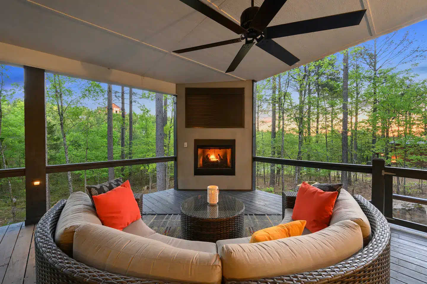 ~The bunk room leads out to the 760 sq ft covered deck complete with a comfortable seating area to enjoy the outdoor fireplace and smart television. There is a built in GRILL and mini fridge, and yet another seating area in which to congregate and mingle.