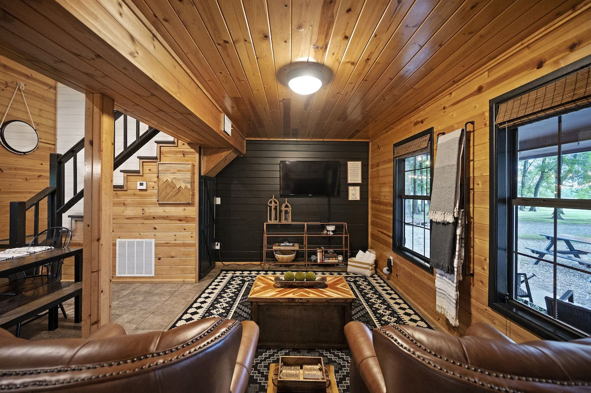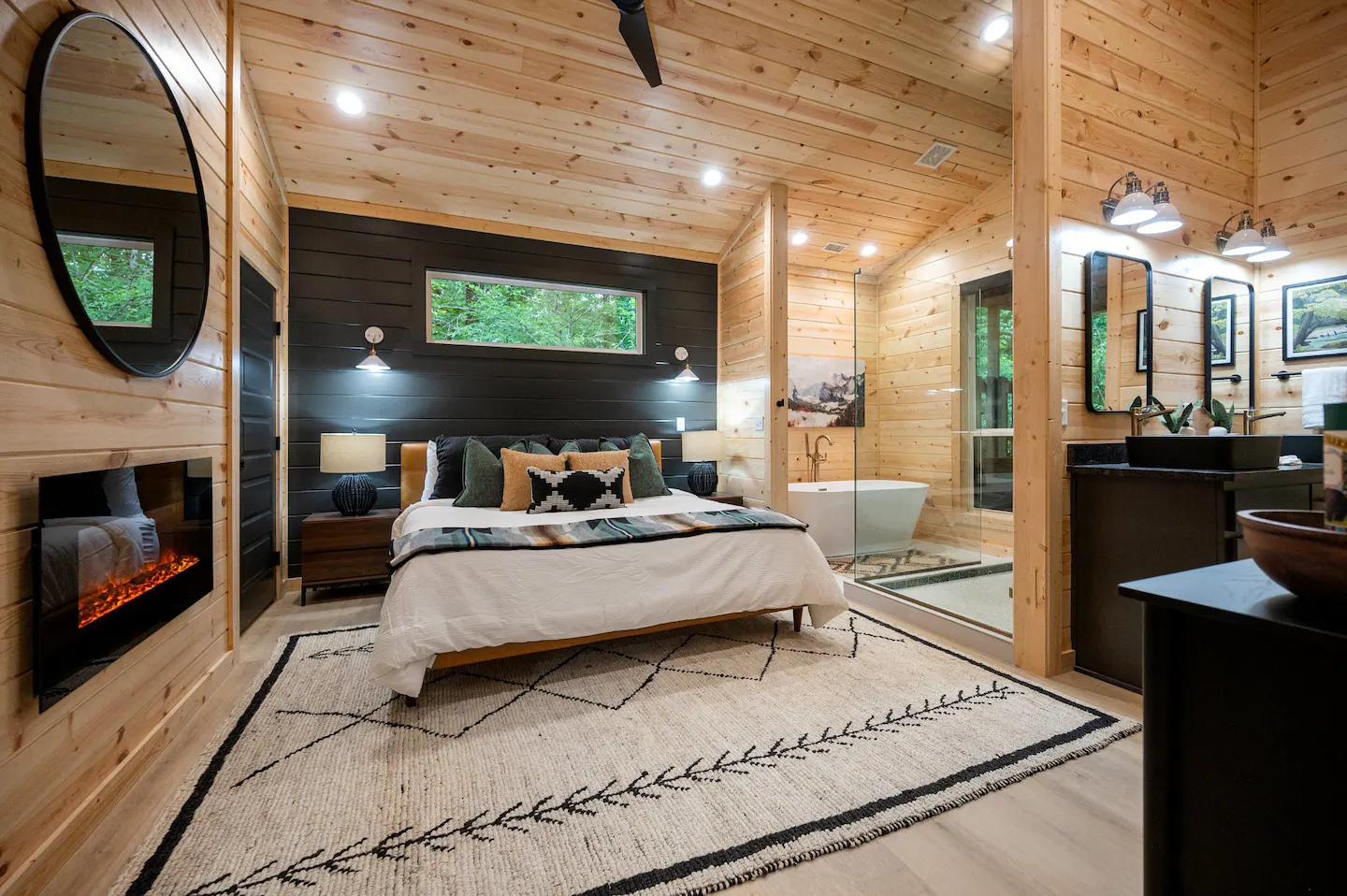 Next on our list is Meadowlark Retreat, a swanky 1,200 sq-ft couples’ cabin, positioned at the quiet end of a cul-de-sac in Sunrise Ridge, serves up an exclusive slice of relaxation with a twist of eco-friendly sophistication.