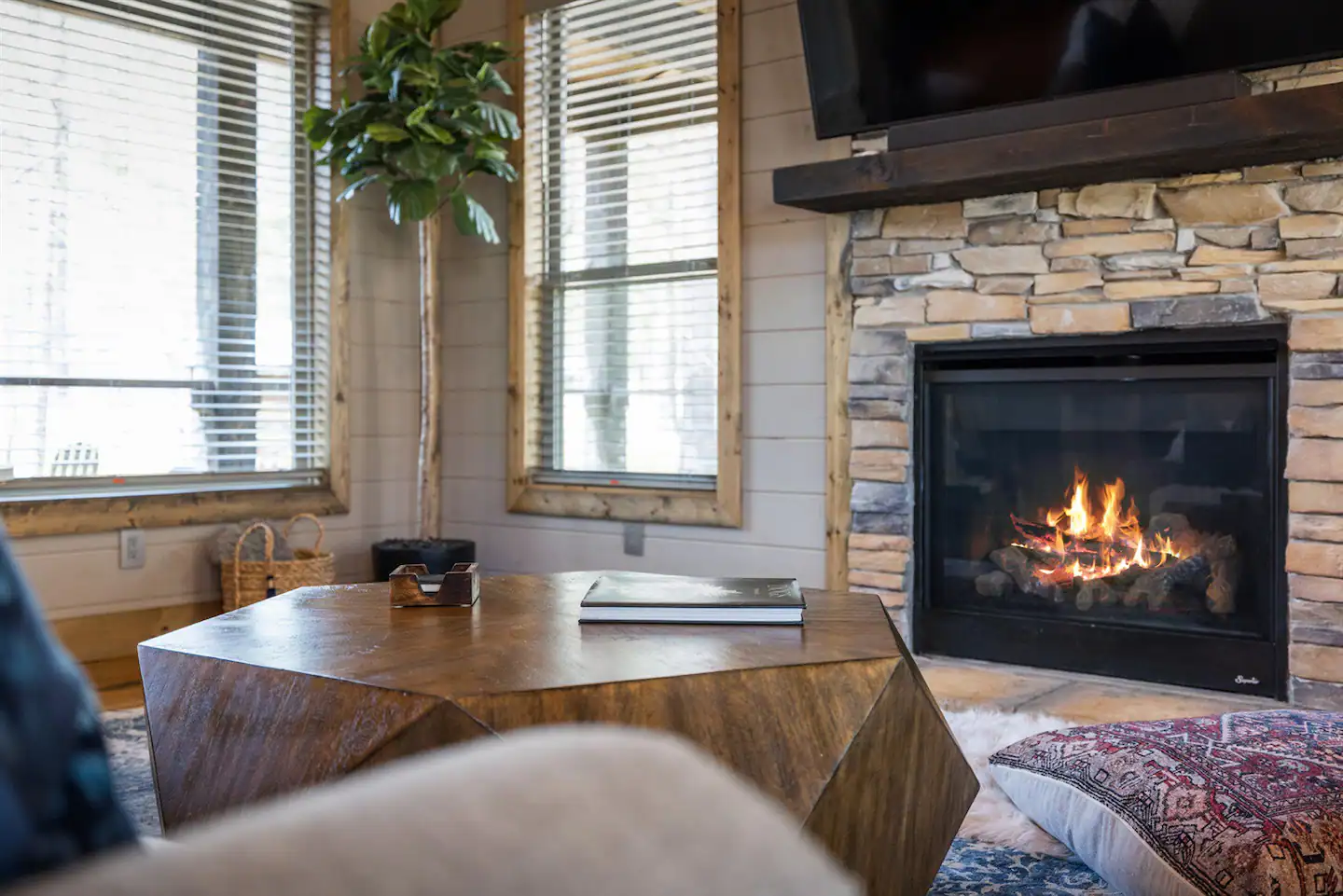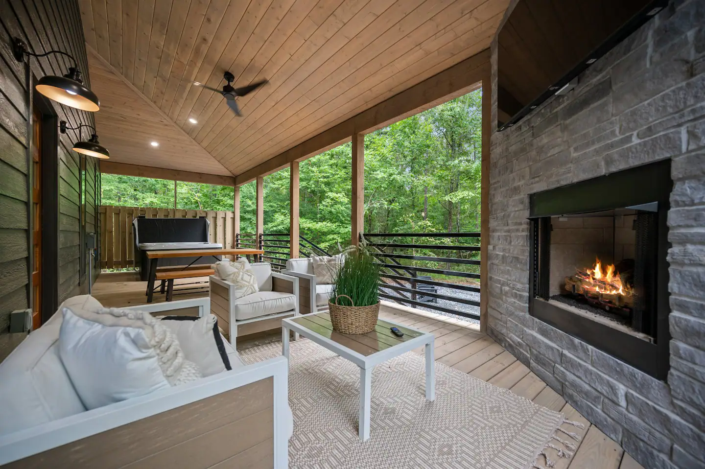 Out on the covered deck, the setup is all about leisure. Pop into the five-person hot tub or cozy up by the flagstone fireplace. With no other cabins behind this one, your privacy is paramount. The space is kitted out with a gas grill and a fire pit—perfect for an evening s’mores session or just some good old-fashioned star gazing.