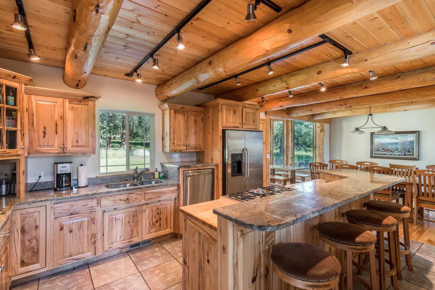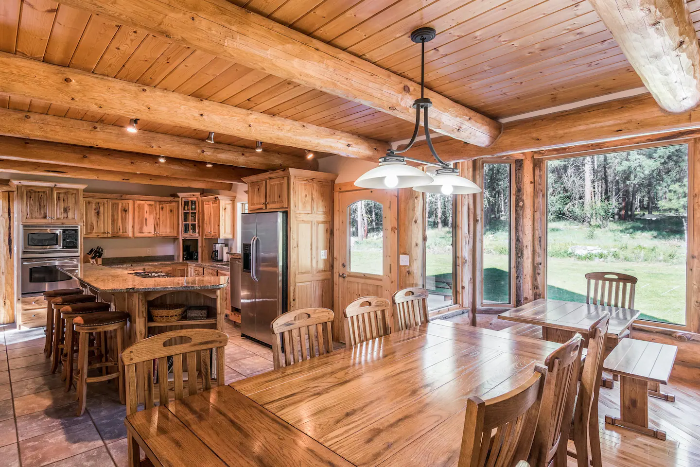 This home is a handcrafted log-accented home on the edge of the Bitterroot National Forest. The area teems with wildlife, and the home is close to several hiking entry points.