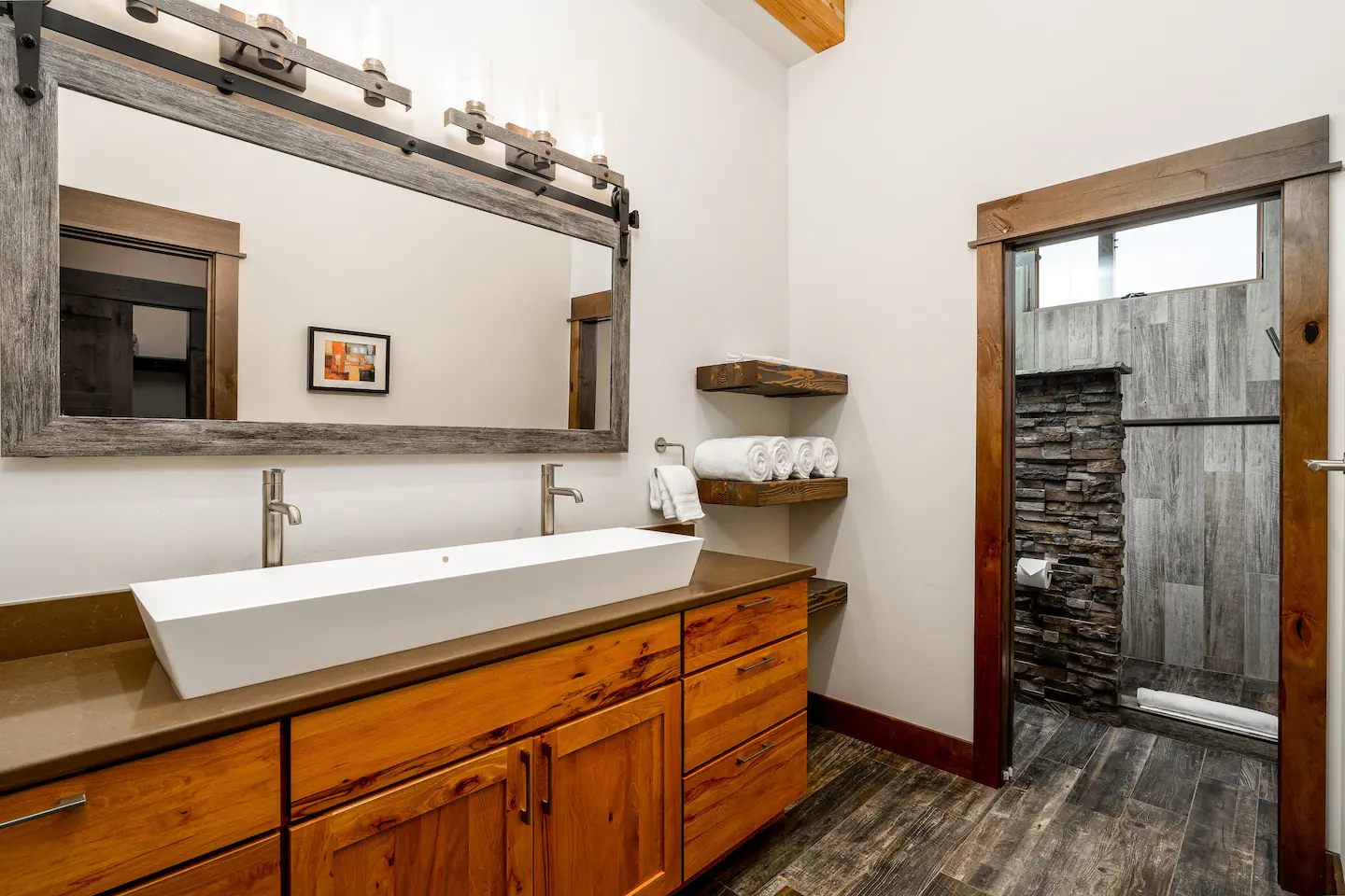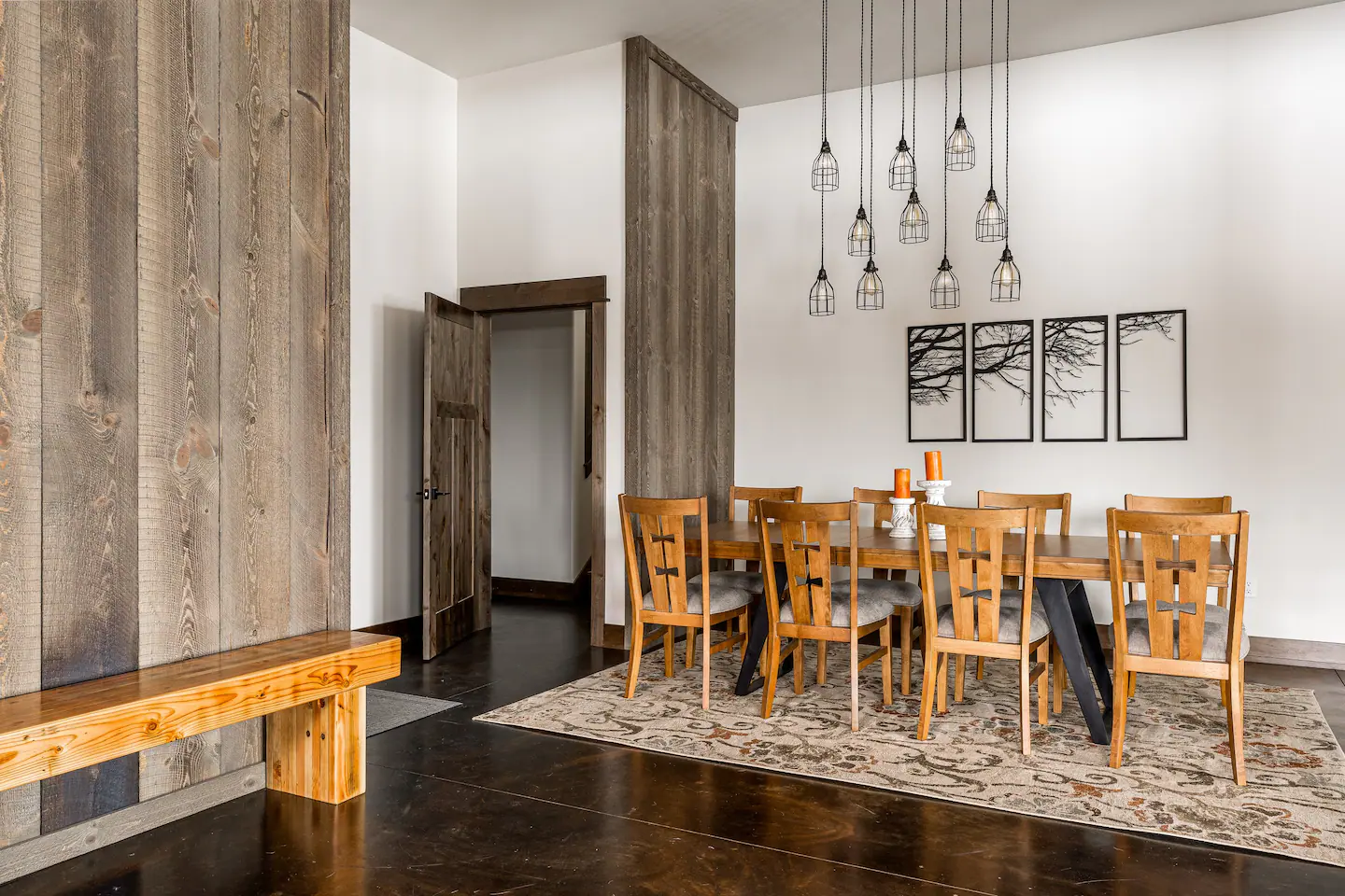 This home has two spacious kitchens (one upstairs and one downstairs), two great rooms, and six bedrooms, including a bunk room on each level. There’s a double-sided fireplace on the lower level and another fireplace upstairs for cozy leisure time. It’s perfectly located for easy access to Big Sky Resort (10 min), Yellowstone Park (30 min), Blue Ribbon fishing access on the Gallatin River (walking distance), and countless other outdoor pursuits. It’s the perfect solution for multiple families traveling together, a large wedding party or corporate group, or just a bunch of friends looking to vacation together!