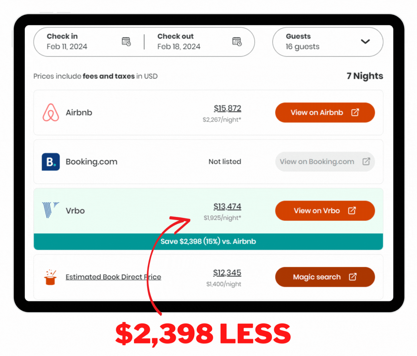 HiChee’s comparison feature shows that it’s $1,432 less to book this property on VRBO than on Airbnb.