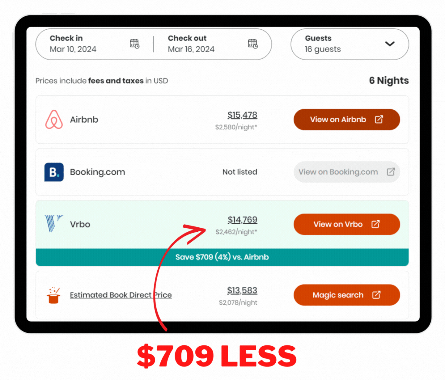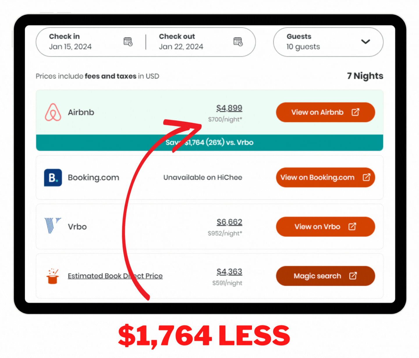 HiChee’s comparison feature revealed that I could save $709 by booking on VRBO instead of Airbnb, allowing me to splurge on activities or souvenirs during my trip.