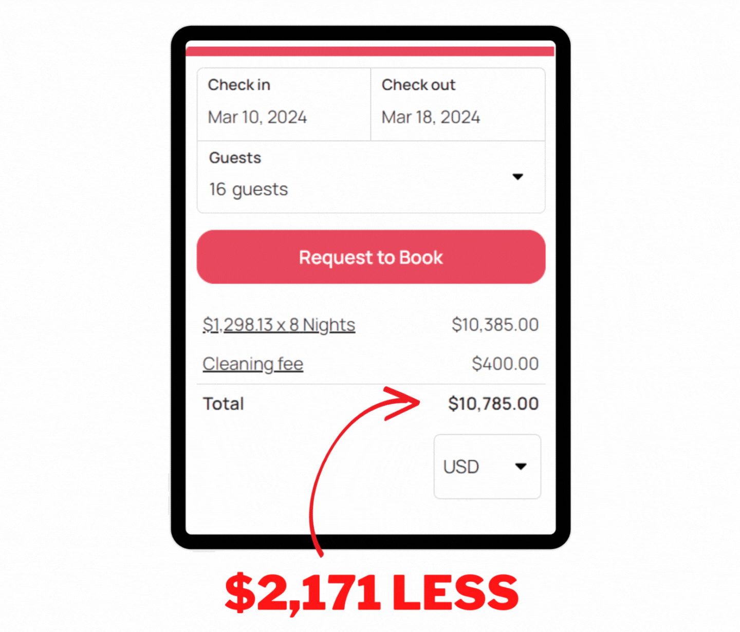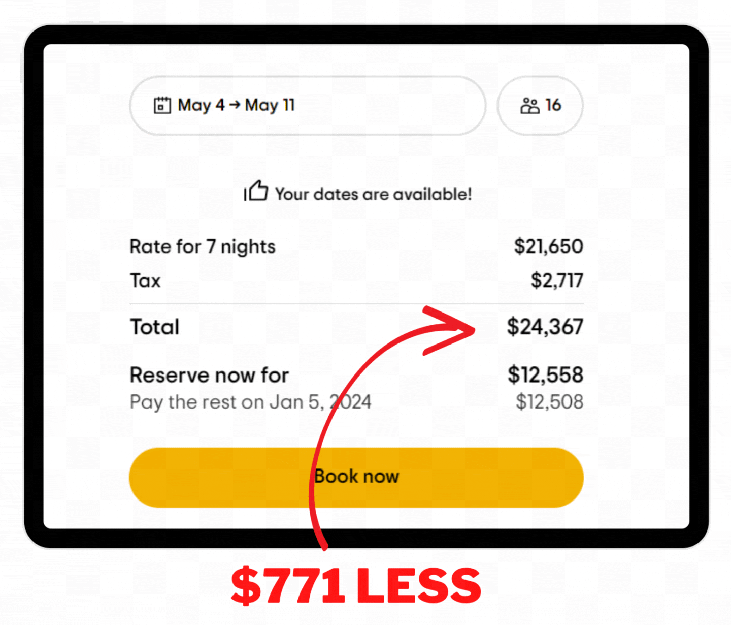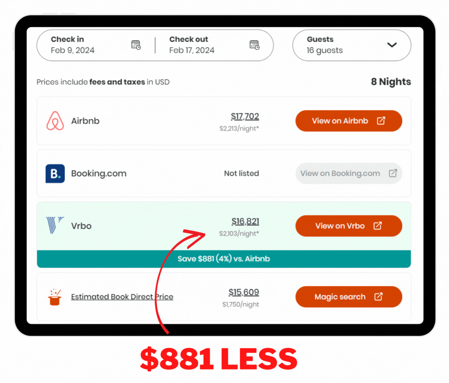 Make the smart choice and save $881 by booking through VRBO, surpassing the prices you’ll find on Airbnb.
