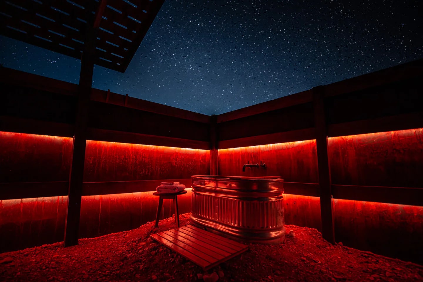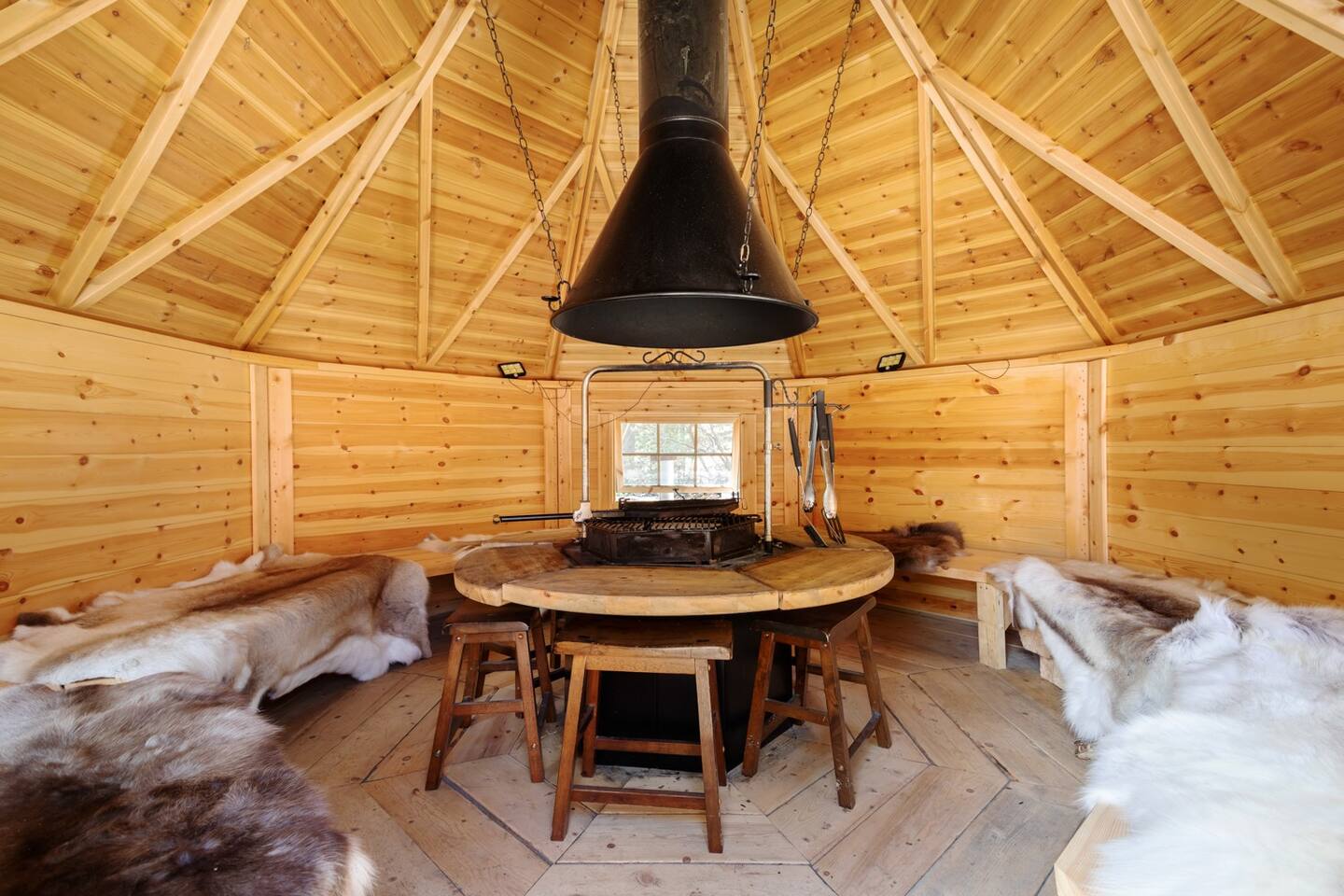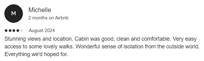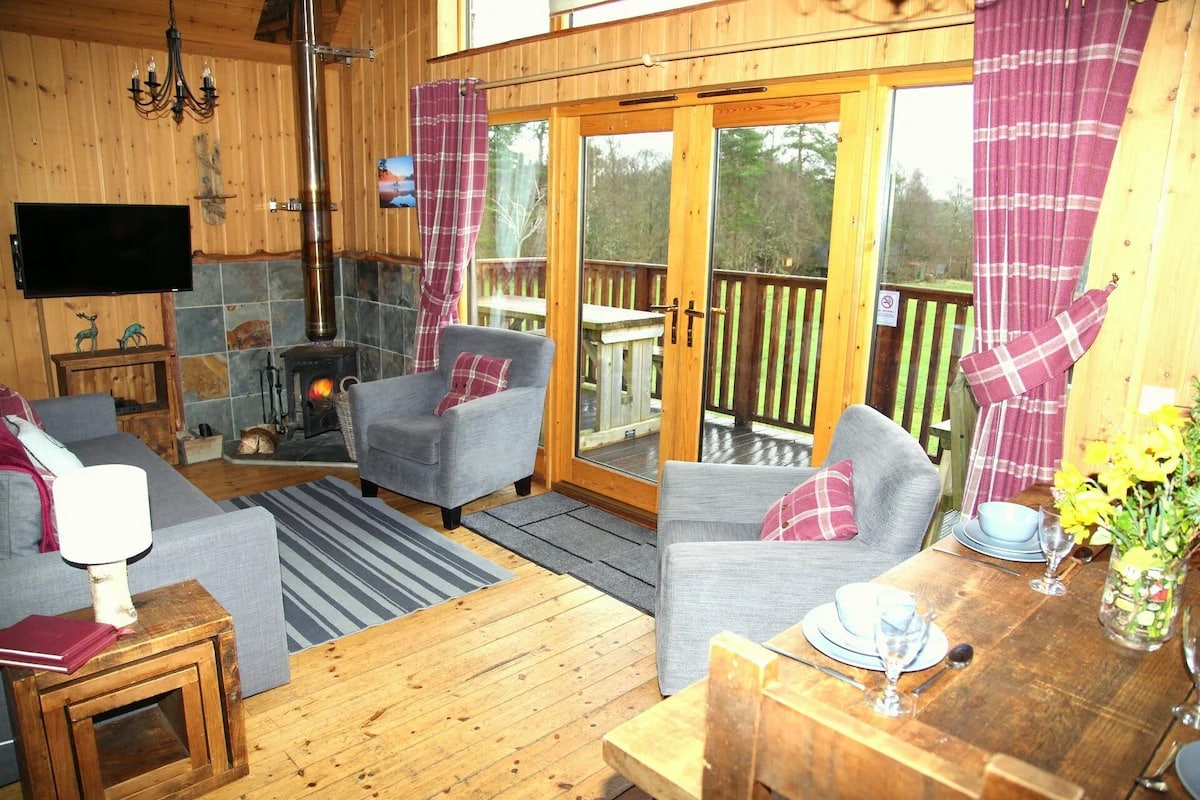 The cabin sleeps six and features a wood-fueled hot tub (available for an extra fee), perfect for those chilly autumn nights under the stars. The open-plan lounge and dining area, with its high vaulted ceilings, wood-burning stove, and French windows, will have you feeling cozy and connected to nature while still indulging in some luxury.