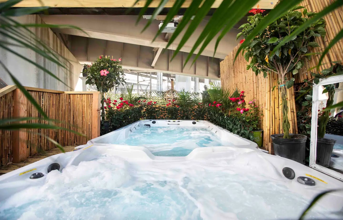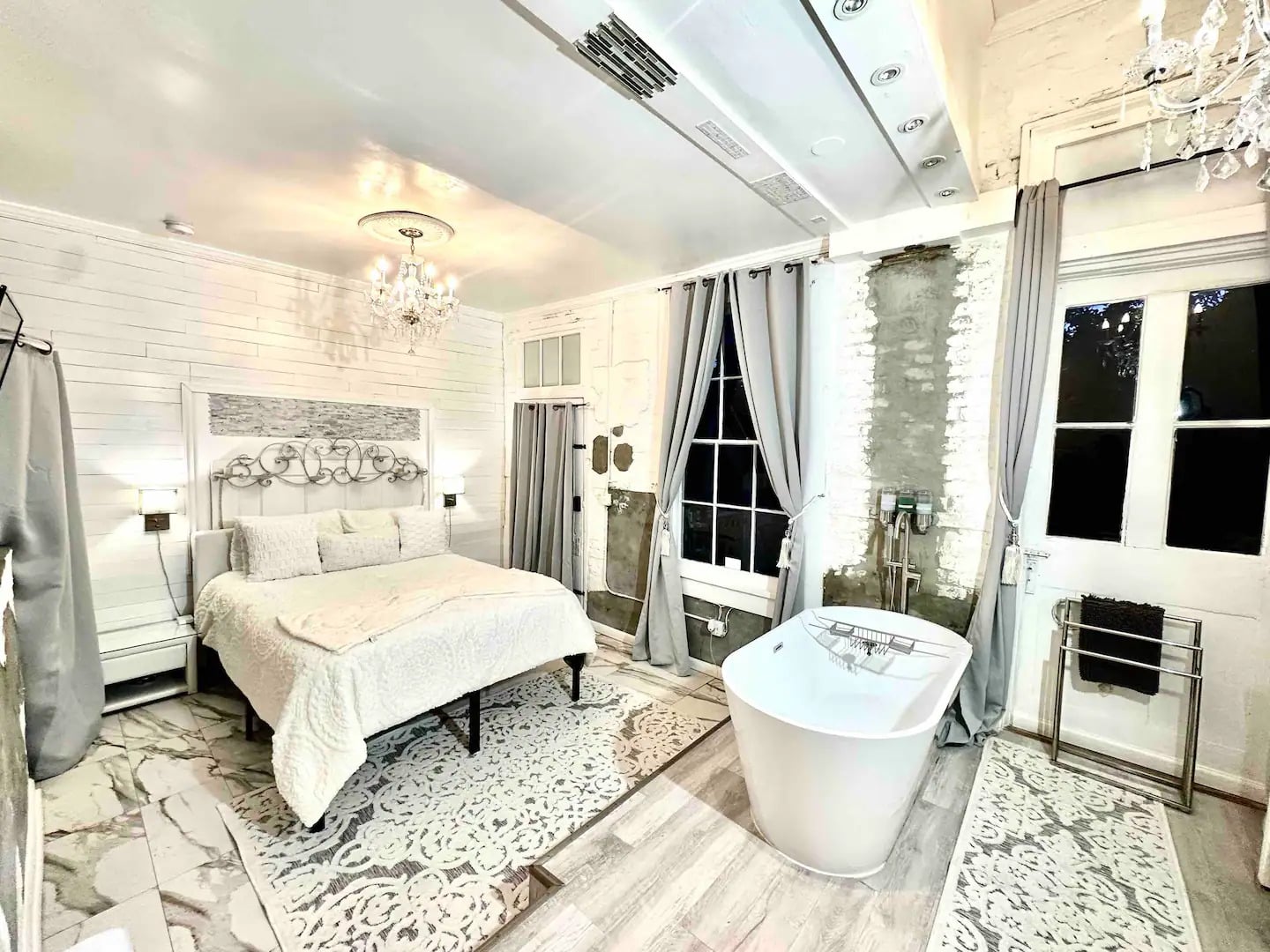 Set on over 2.5 acres, this rad chalet boasts a round bed, private two-person hot tub, and a glittery clawfoot tub by a fireplace for all your witchy bath rituals. You’ll also have your own deck with breathtaking views of the forest—ideal for those chilly autumn nights. Plus, the room comes with a kitchenette, microwave, mini fridge, and a grill for whipping up your favorite spooky snacks.