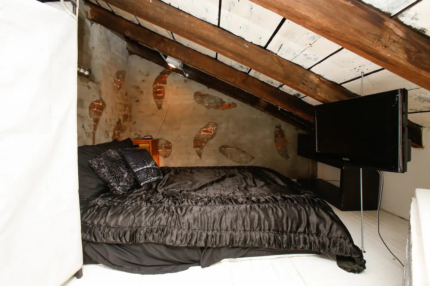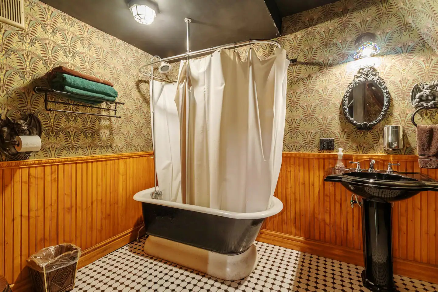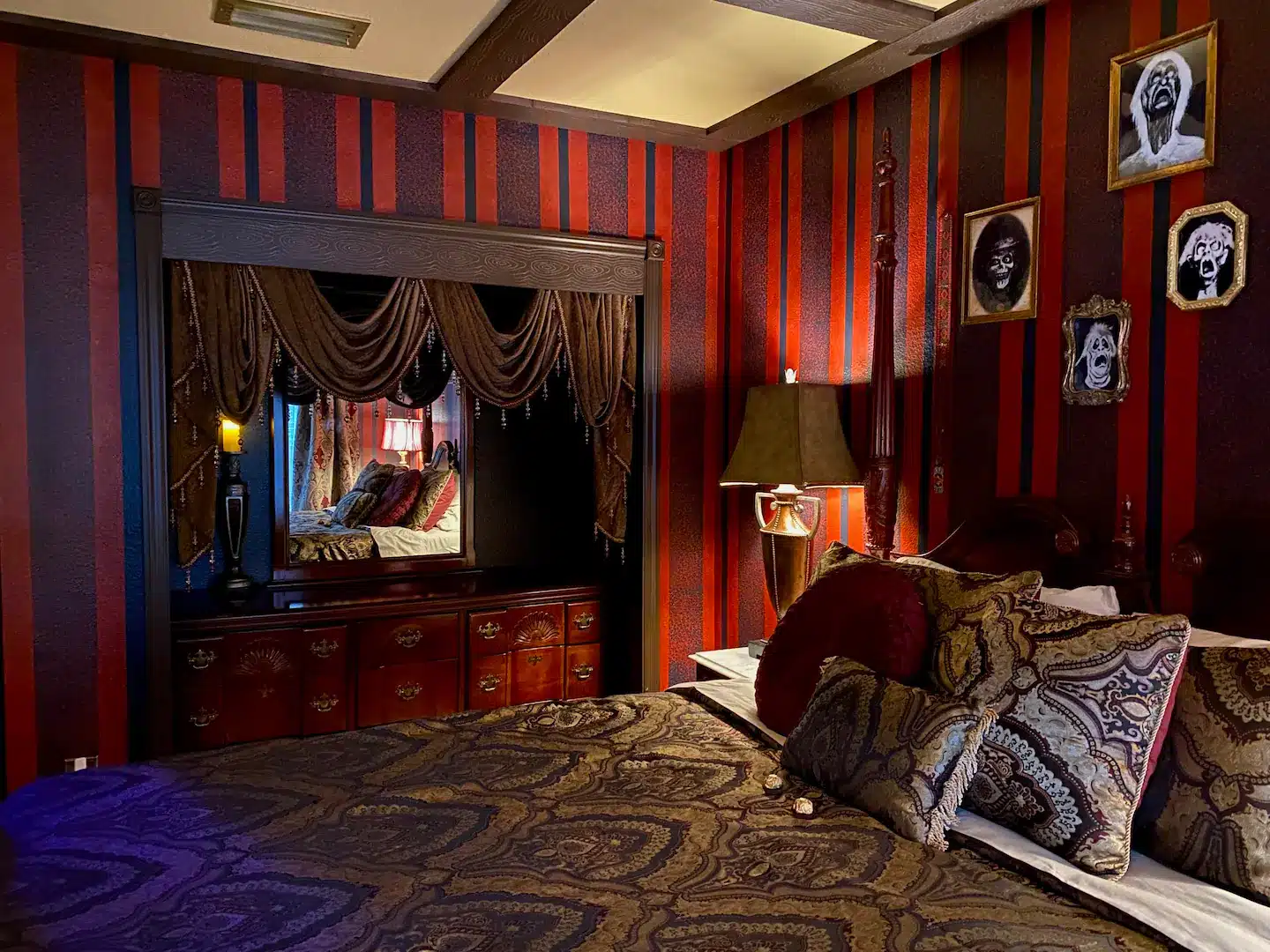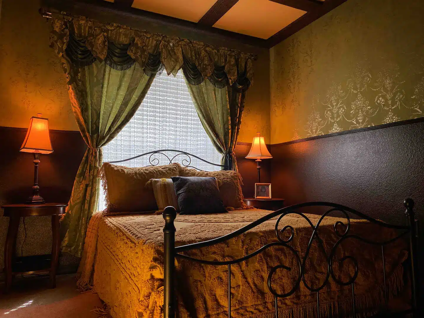 You’ll sleep like the dead in one of three themed rooms, including the Black Widow Bride’s attic, complete with a queen bed that’s a little too cozy for comfort. Master Gracey’s moldering sanctum offers another queen bed, perfect for you and a brave companion. For fans of The Conjuring or The Witch, the Hatbox Ghost’s workroom provides a full bed surrounded by spooky relics.