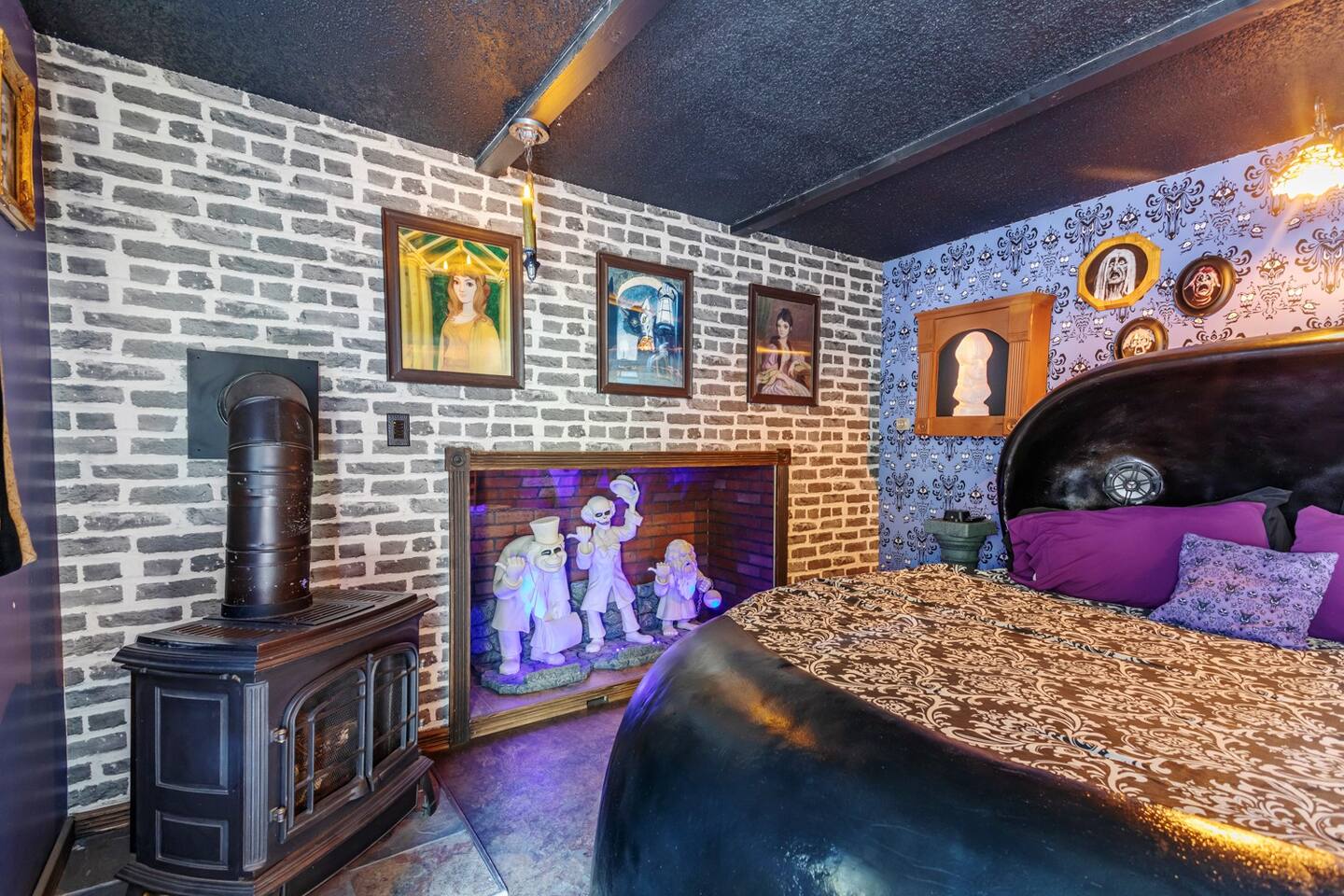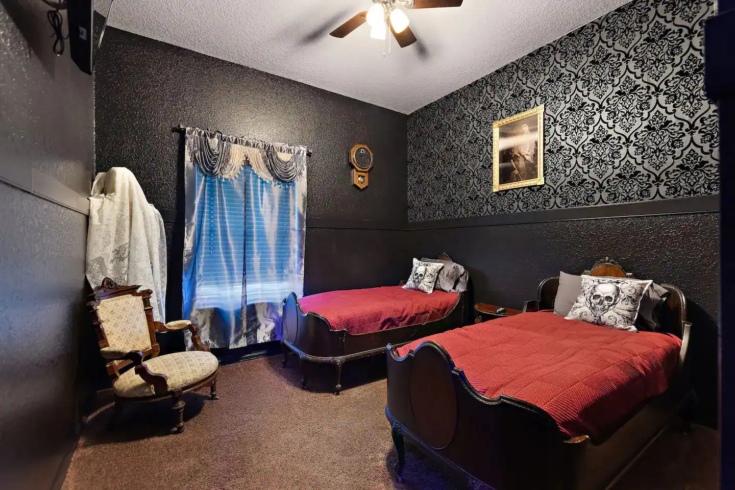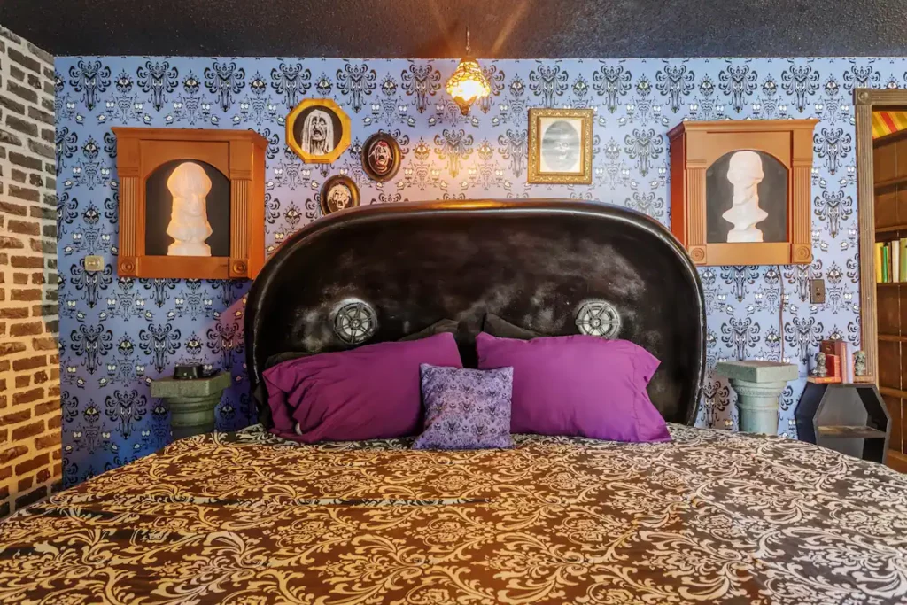 This haunted haven features four themed bedrooms: sleep like the dead in the Master Gracey Room with its California King bed, or conjure spirits in the Madame Leota Room. The Hatbox Ghost Room offers another queen bed, while The Raven Room features twin beds perfect for little ghouls.