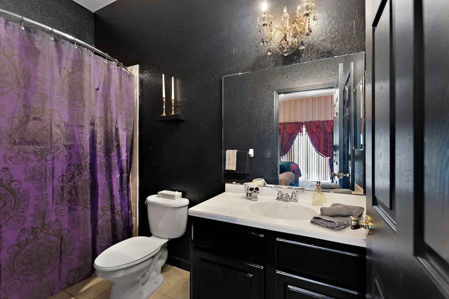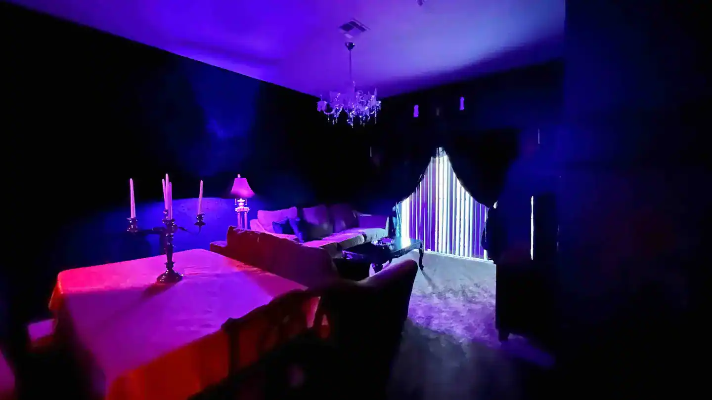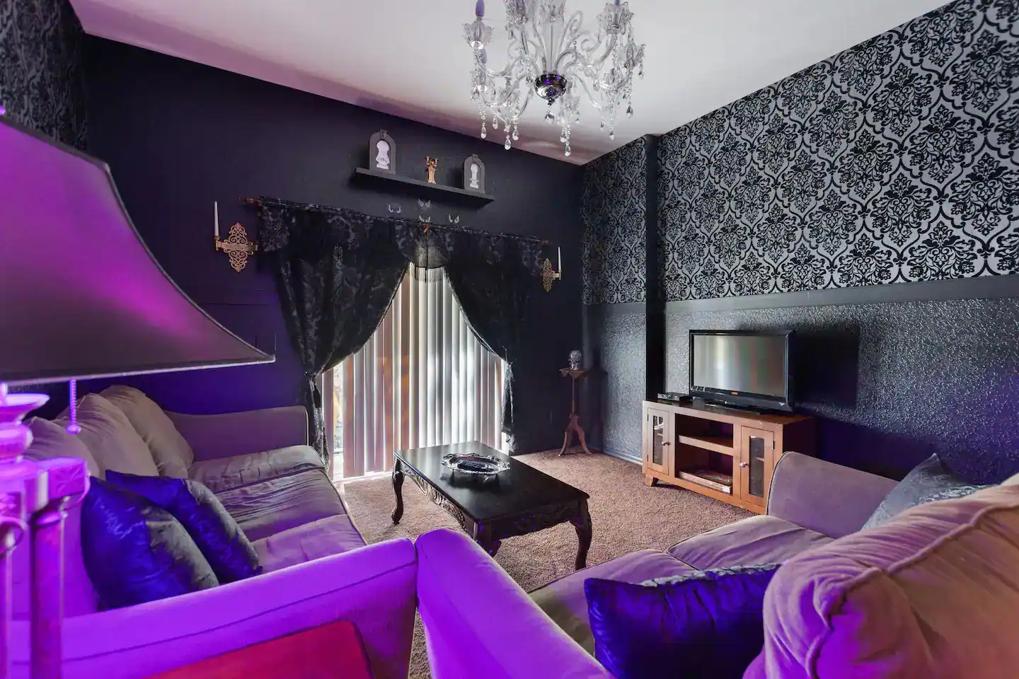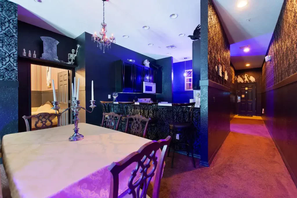 This ghastly mansion has room for six happy haunts, with a fully equipped kitchen, two bathrooms, and laundry at your disposal. Enjoy creepy comforts like weird glowing lights and gothic decor straight out of a horror novel. The parlor and dining room are ready for a “swinging wake” or some ghostly socializing.