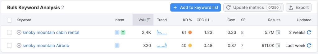 I ran search data for Smoky Mountain cabin rental and Smoky Mountain Airbnb. Smoky Mountain cabin rental gets over seven times the number of monthly searches compared to the Airbnb search.