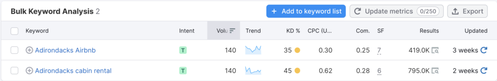 And for cabin searches in The Adirondacks. Both searches here get the same traffic.